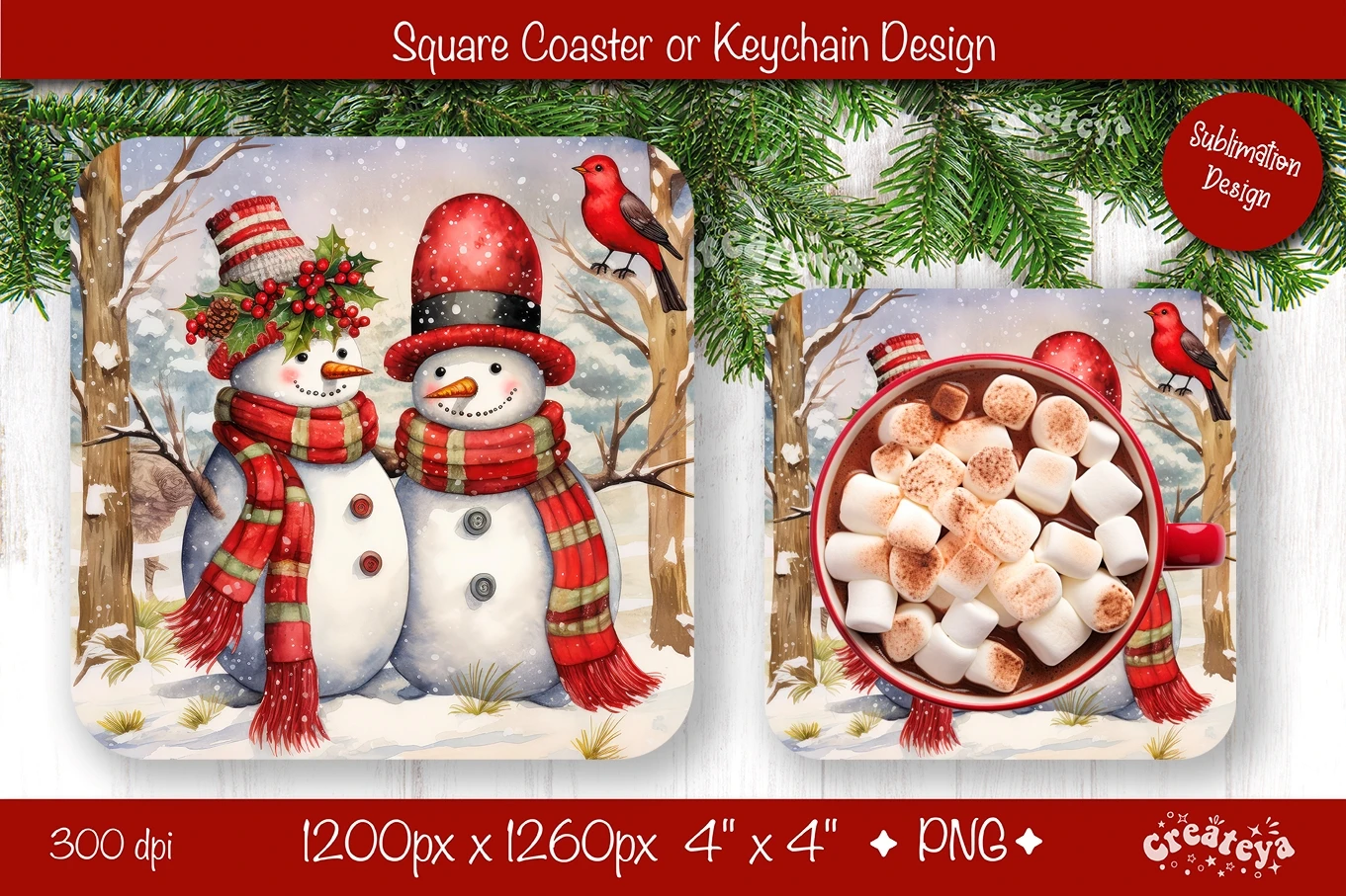 Square Coaster Christmas Coasters design with a cute Snowman PNG. These standard square coasters 4'' x 4'' are more than just a way to protect your table they bring a touch of snow-filled charm and a warm, fuzzy feeling to your home decor.