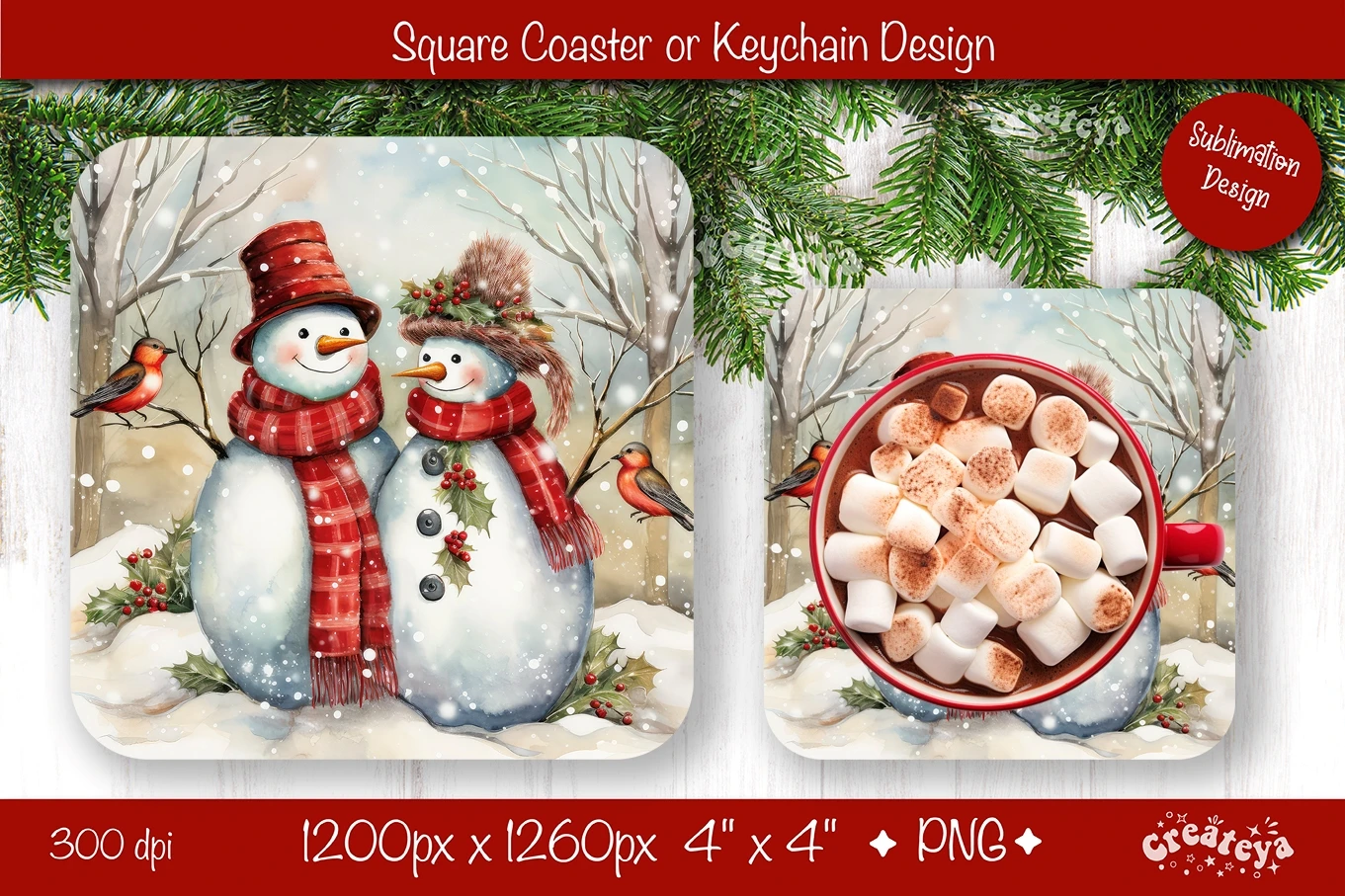 Square Coaster Christmas Coasters design with a cute Snowman PNG. These standard square coasters 4'' x 4'' are more than just a way to protect your table they bring a touch of snow-filled charm and a warm, fuzzy feeling to your home decor.
