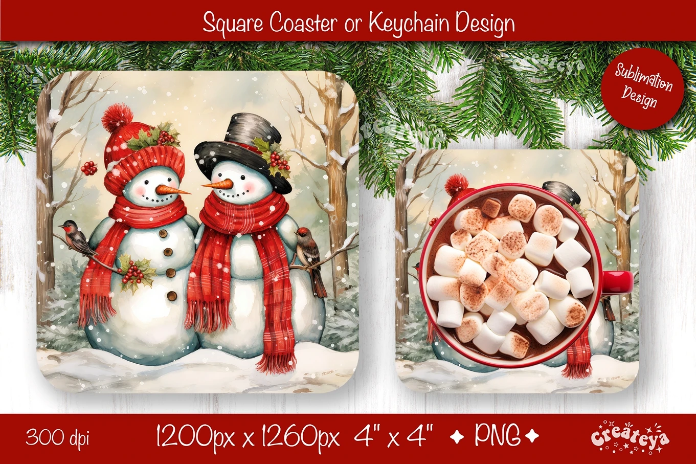 Square Coaster Christmas Coasters design with a cute Snowman PNG. These standard square coasters 4'' x 4'' are more than just a way to protect your table they bring a touch of snow-filled charm and a warm, fuzzy feeling to your home decor.