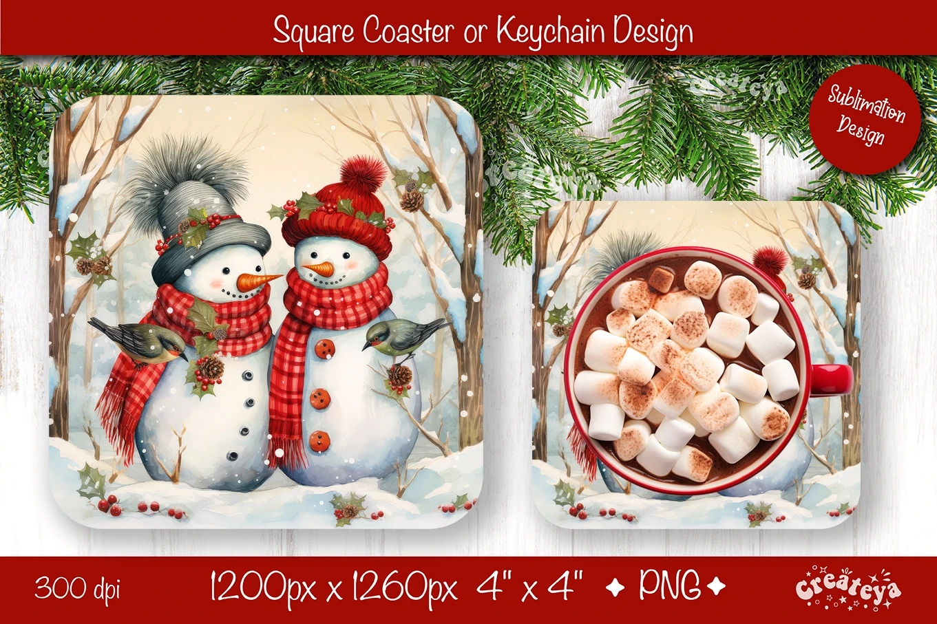 Square Coaster Christmas Coasters design with a cute Snowman PNG. These standard square coasters 4'' x 4'' are more than just a way to protect your table they bring a touch of snow-filled charm and a warm, fuzzy feeling to your home decor.