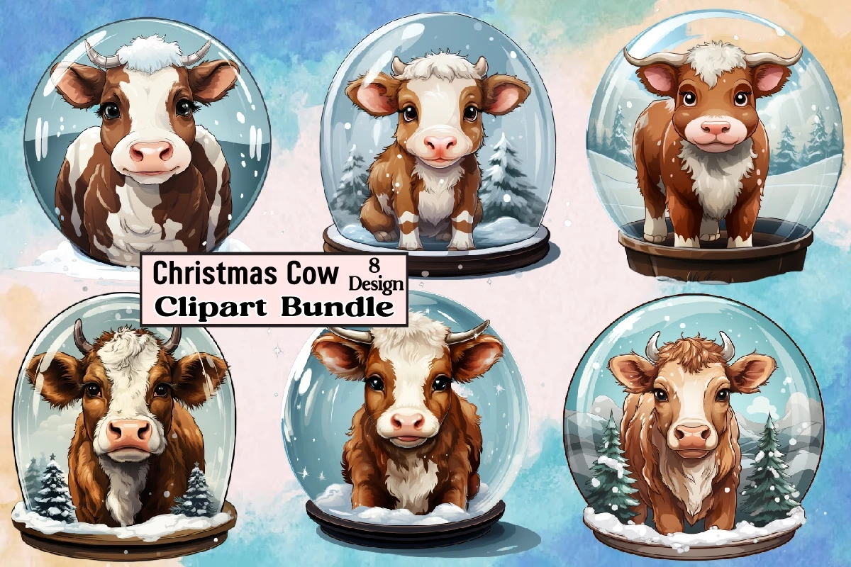 Watercolor Christmas Cow Clipart PNG Bundle