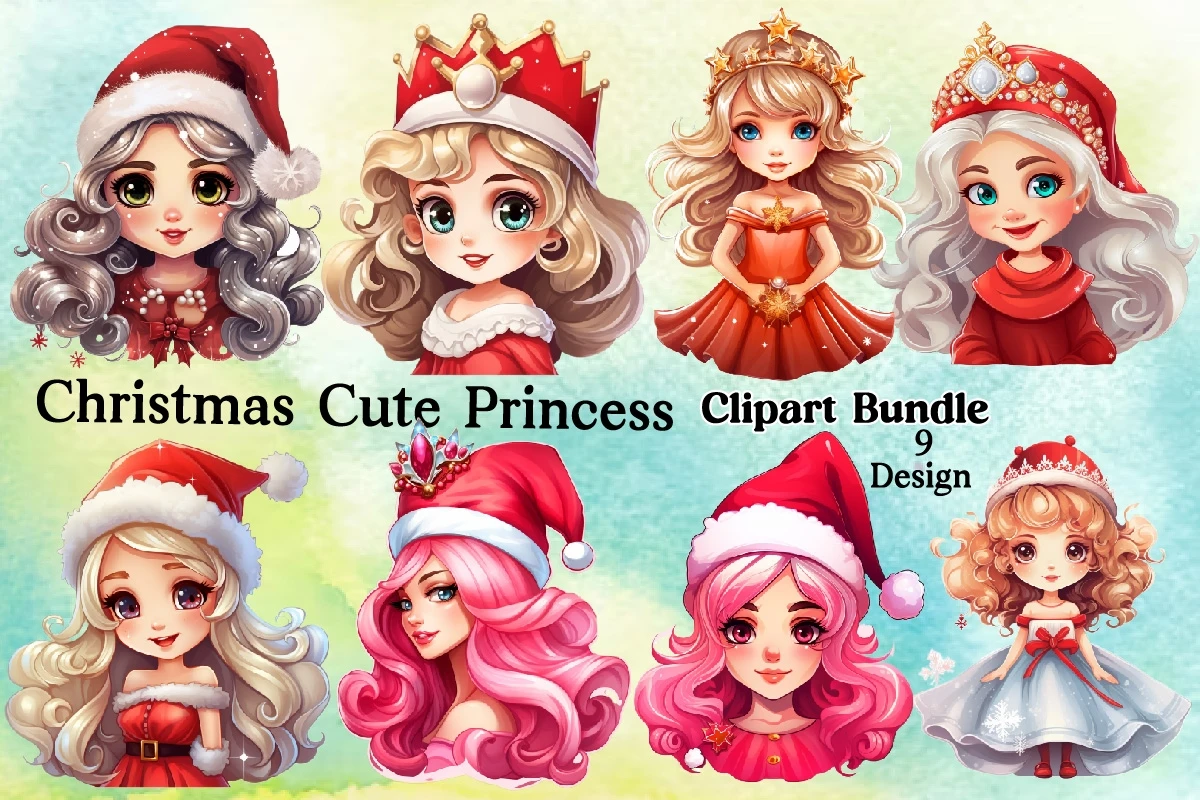 Watercolor Christmas Cute Princess Clipart PNG Bundle