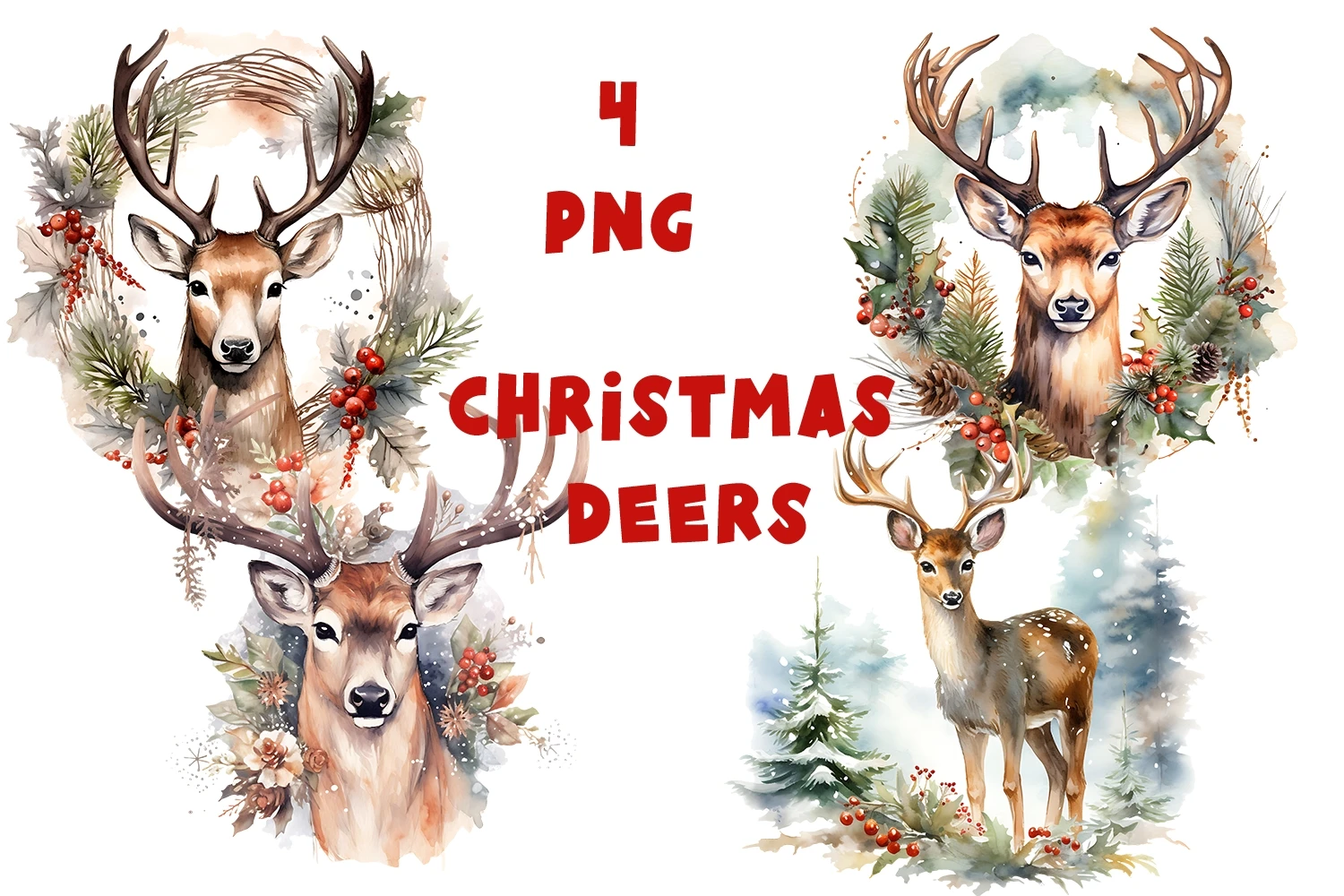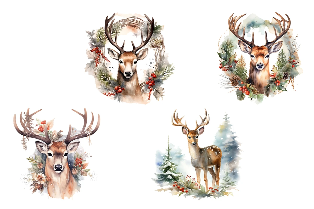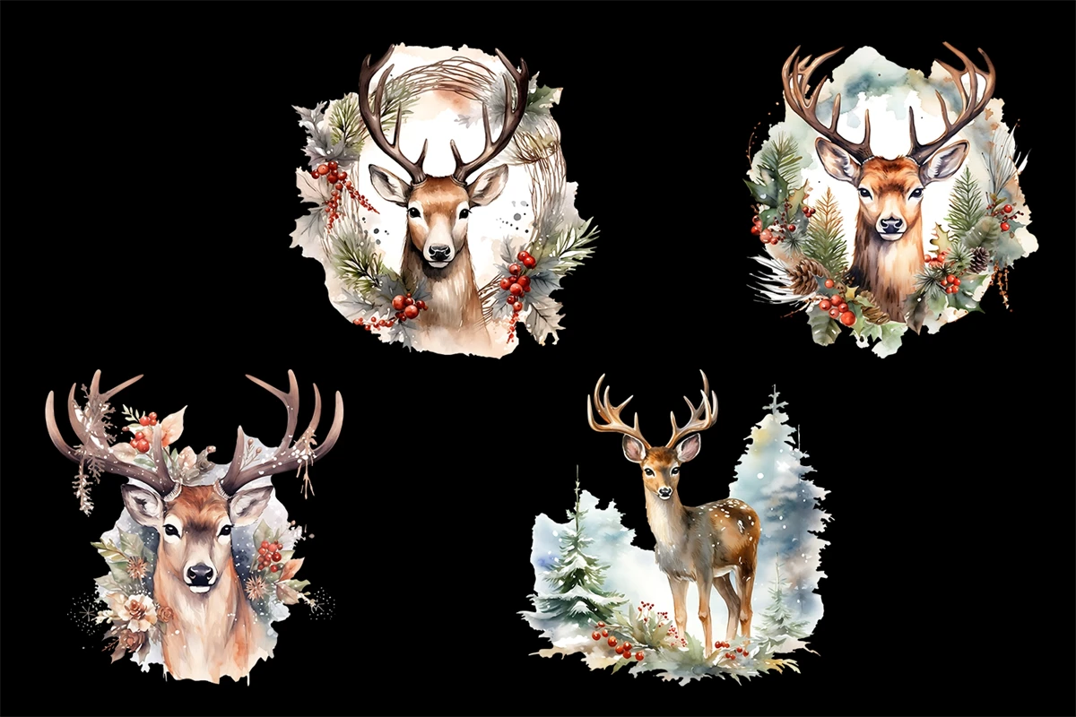 Colorful, festive and fun! Features 4 holiday Deer embellished with Christmas greenery. Individually saved for ease of use, these xmas elements are perfect for your fabulous designs.