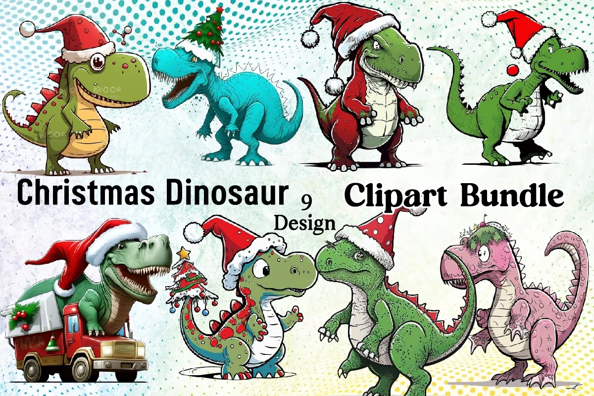 Watercolor Christmas Dinosaur Clipart PNG Bundle