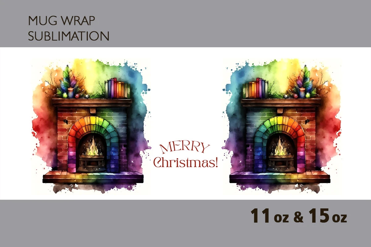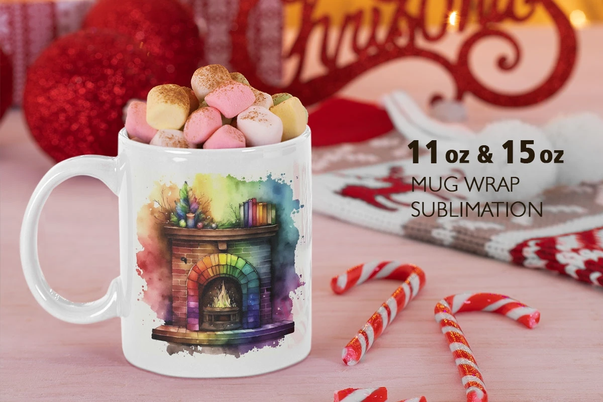 Cute Watercolor Christmas Fireplace mug wrap sublimation design for 11 oz and 15 oz.