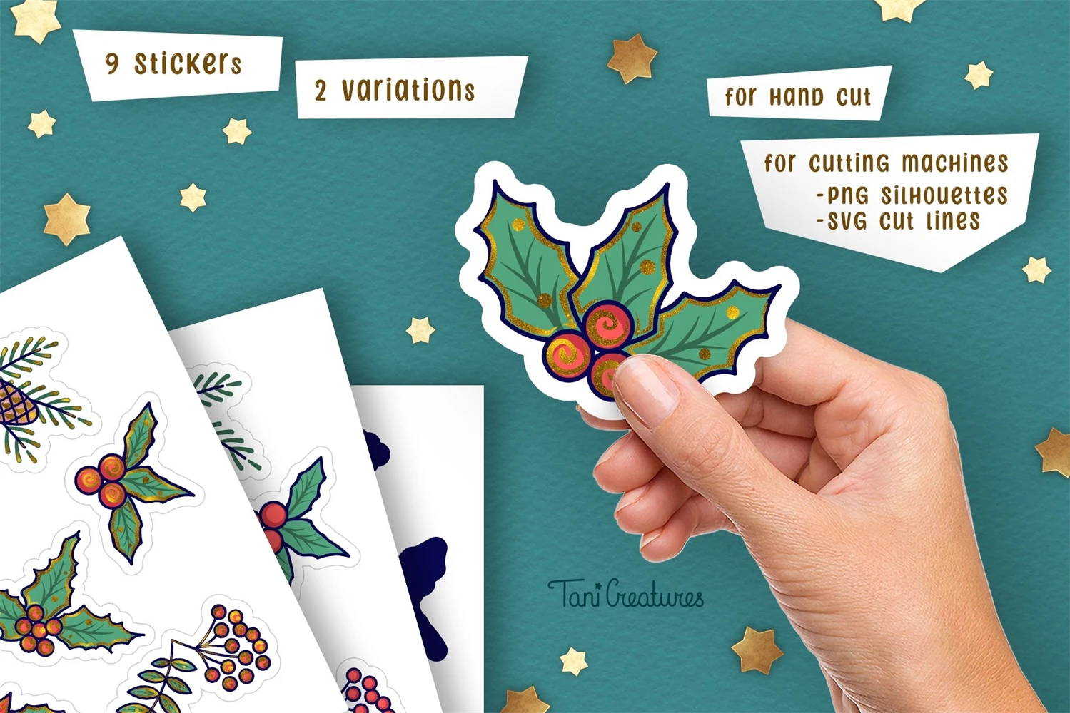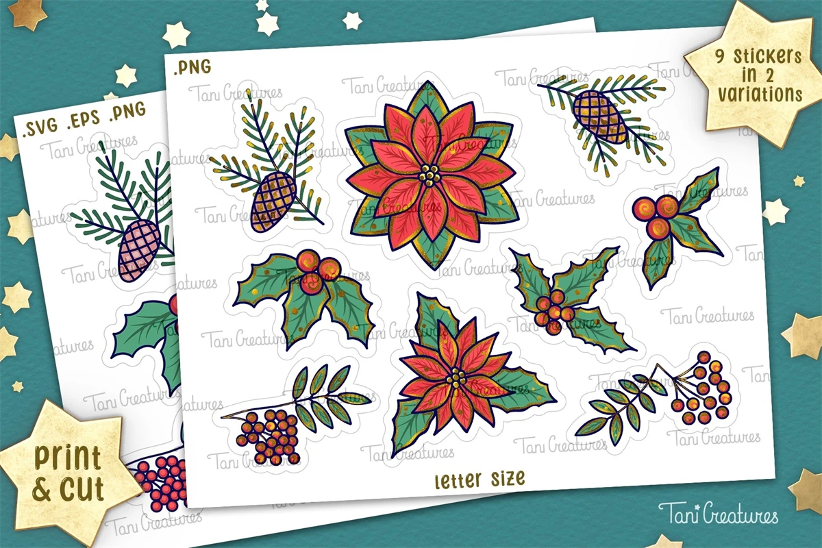 Beautiful Christmas Floral Stickers with Gold Glitter Lines for hand cut & Cricut: Christmas Tree branch, Poinsettia, Holly, Rowan. Print and Cut! Create a wonderful mood at this magical time!