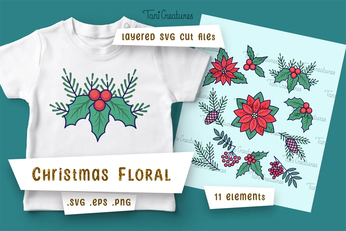 Eleven vector illustrations of Christmas Floral in layered SVG for cut / PNG / EPS file formats! Christmas Tree branch, Poinsettia, Holly & Rowan. Create a wonderful mood at this magical time!