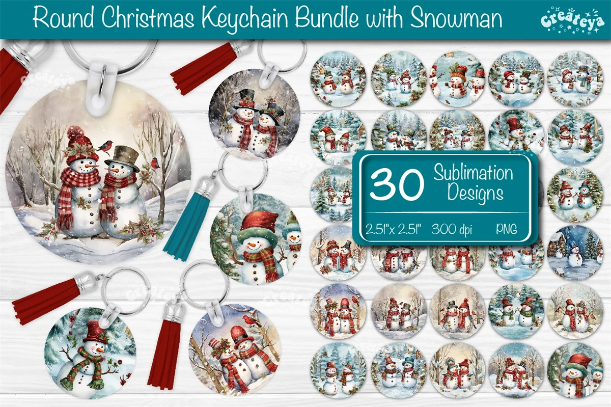 Round Christmas keychain sublimation Bundle contains 30 designs with a cute Watercolor Snowman Keychain PNG. Christmas Sublimation Round keychain with adorable snowmen, vibrant colors, and lasting memories. Perfect as a delightful gift.