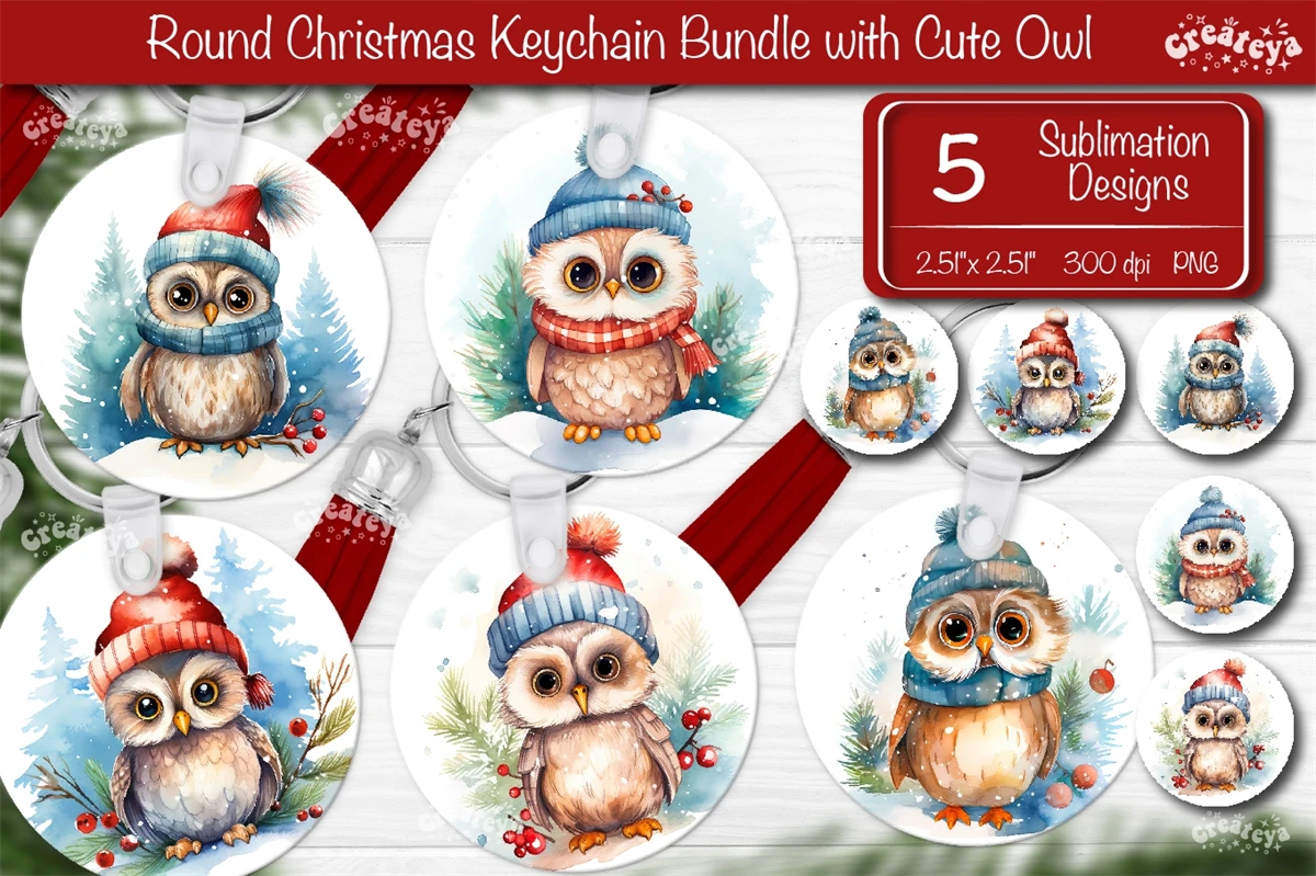 Round Christmas keychain sublimation Bundle contains 5 designs with a cute Christmas Owls Keychain PNG. Christmas Sublimation Round keychain Perfect as a delightful gift.