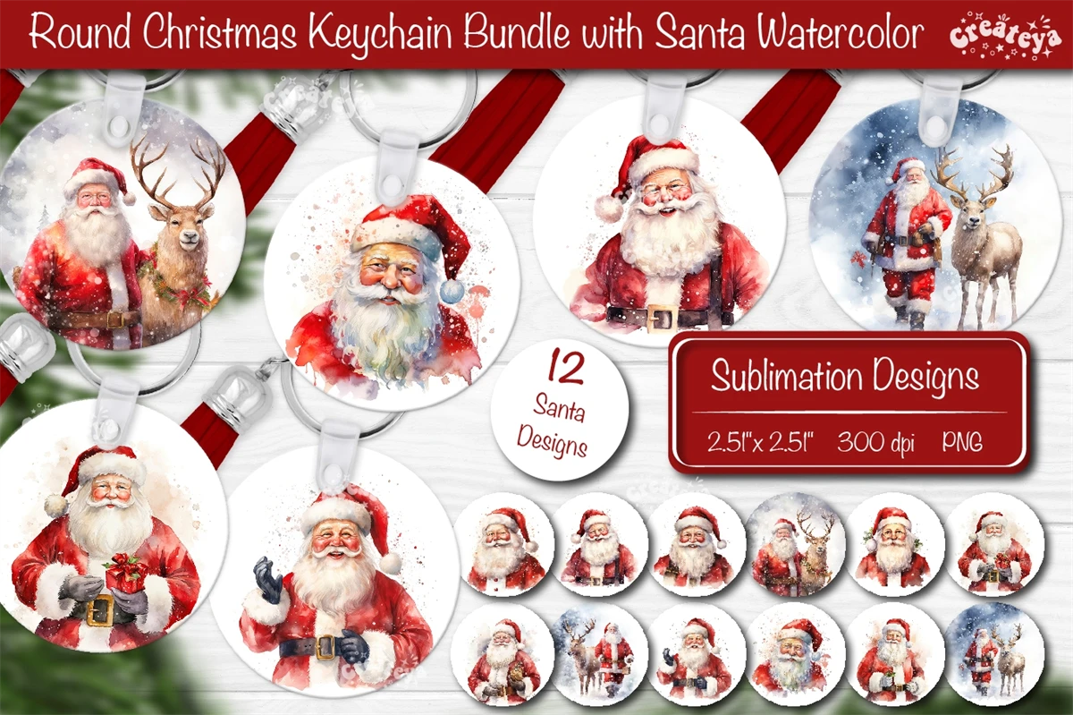 Round Christmas keychain sublimation Bundle contains 12 designs with Watercolor Christmas Santa Keychain PNG. Christmas Sublimation Round keychain Perfect as a delightful gift.
