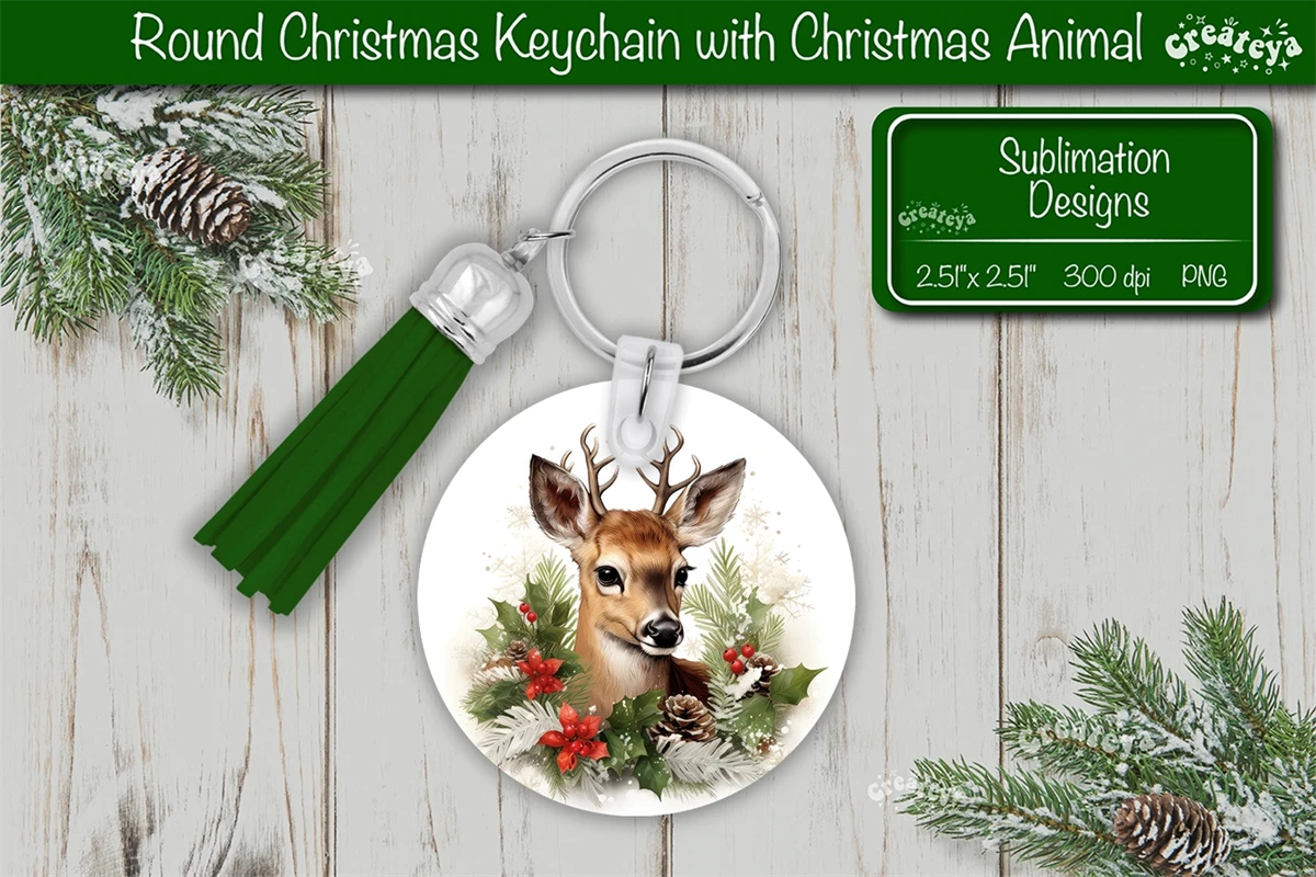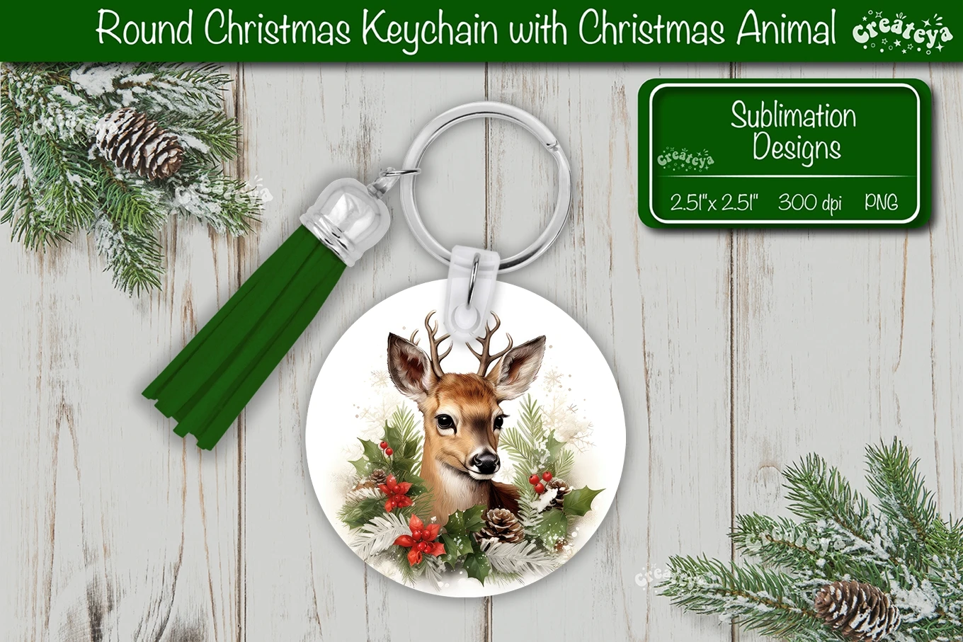 Round Christmas keychain sublimation with a cute Christmas Animals Keychain PNG. Christmas Sublimation Round keychain with adorable animals, vibrant colors, and lasting memories. Perfect as a delightful gift.