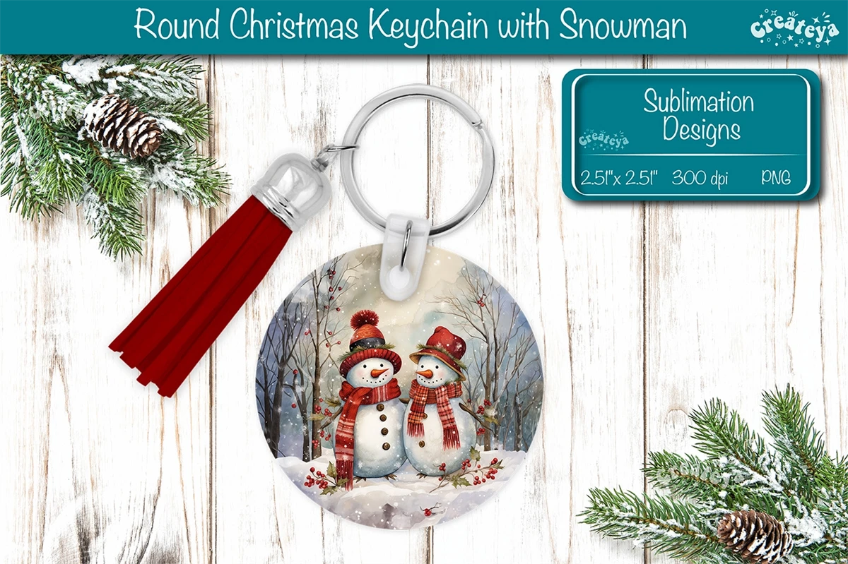 Round Christmas keychain sublimation design with a cute Watercolor Snowman Keychain PNG. Christmas Sublimation Round keychain with adorable snowmen, vibrant colors, and lasting memories. Perfect as a delightful gift.