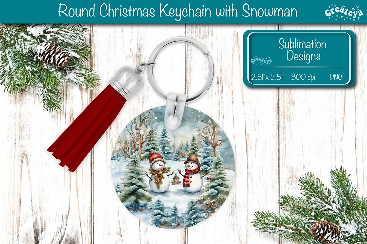 Round Christmas keychain sublimation design with a cute Watercolor Snowman Keychain PNG. Christmas Sublimation Round keychain with adorable snowmen, vibrant colors, and lasting memories. Perfect as a delightful gift.