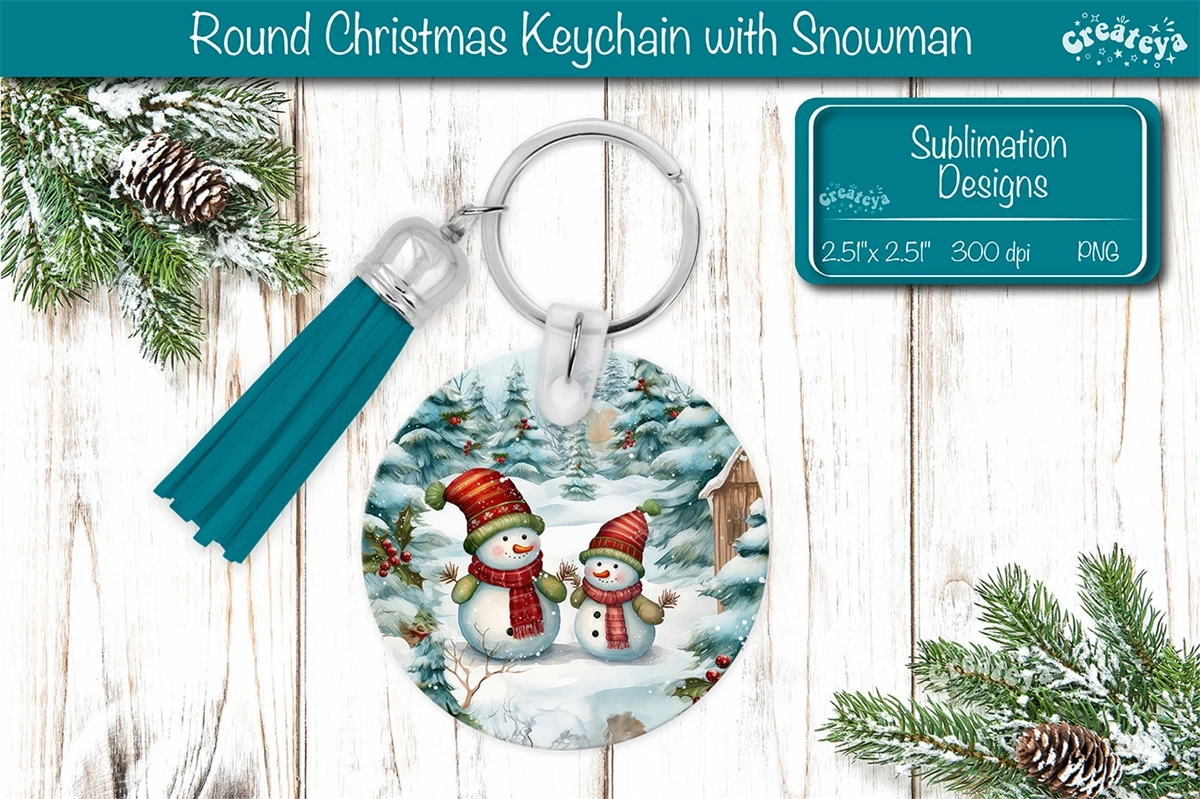 Round Christmas keychain sublimation design with a cute Watercolor Snowman Keychain PNG. Christmas Sublimation Round keychain with adorable snowmen, vibrant colors, and lasting memories. Perfect as a delightful gift.