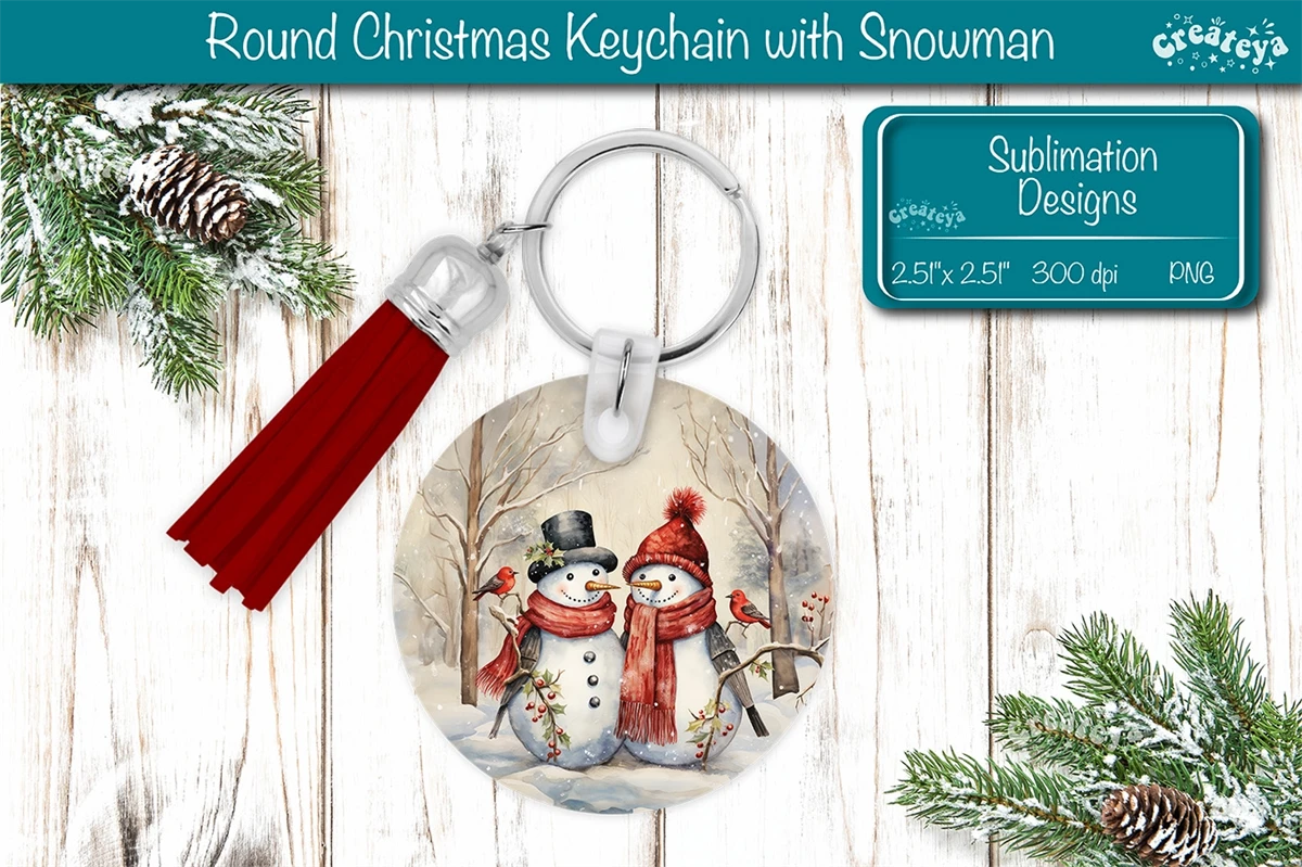 Round Christmas keychain sublimation design with a cute Watercolor Snowman Keychain PNG. Christmas Sublimation Round keychain with adorable snowmen, vibrant colors, and lasting memories. Perfect as a delightful gift.