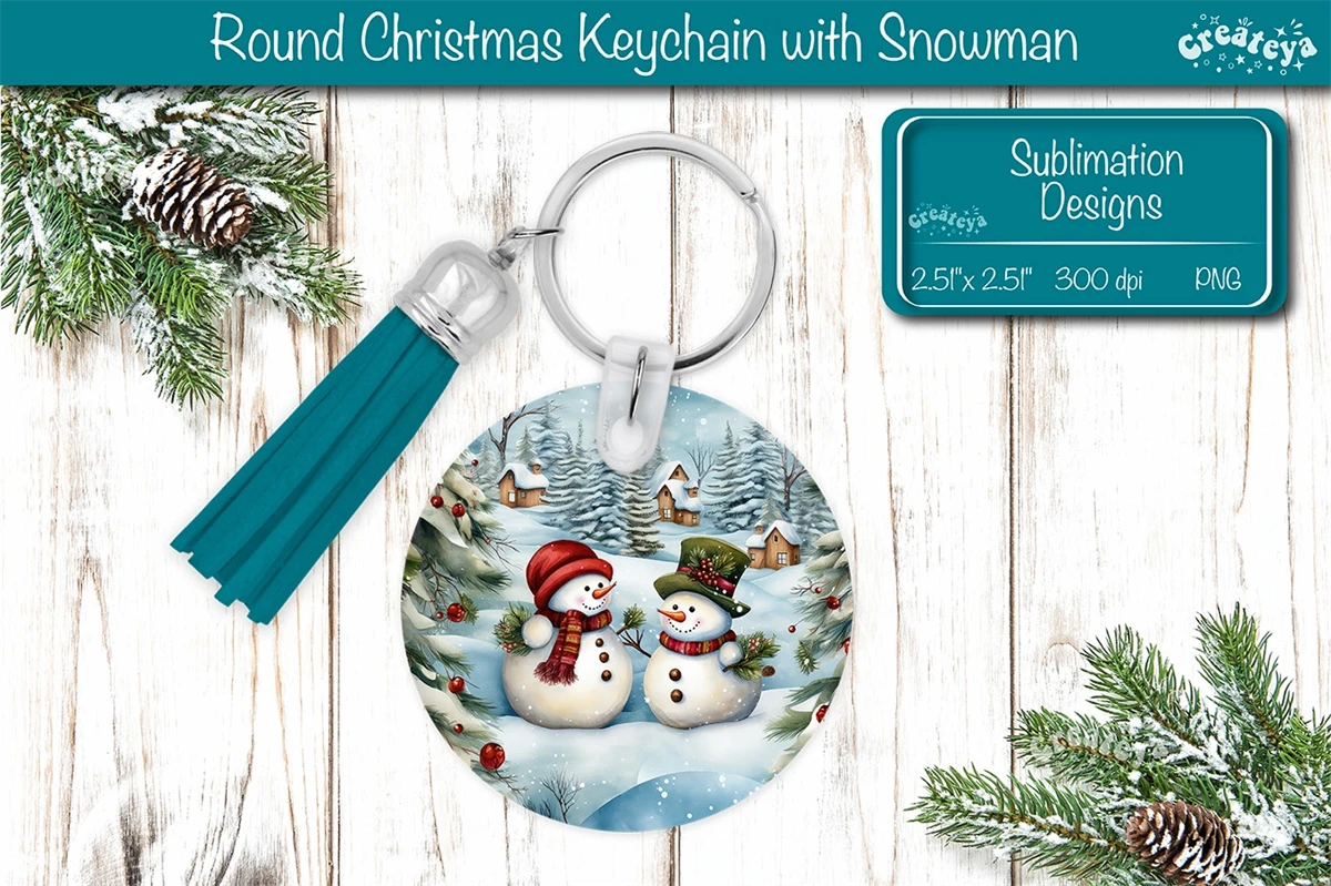 Round Christmas keychain sublimation design with a cute Watercolor Snowman Keychain PNG. Christmas Sublimation Round keychain with adorable snowmen, vibrant colors, and lasting memories. Perfect as a delightful gift.