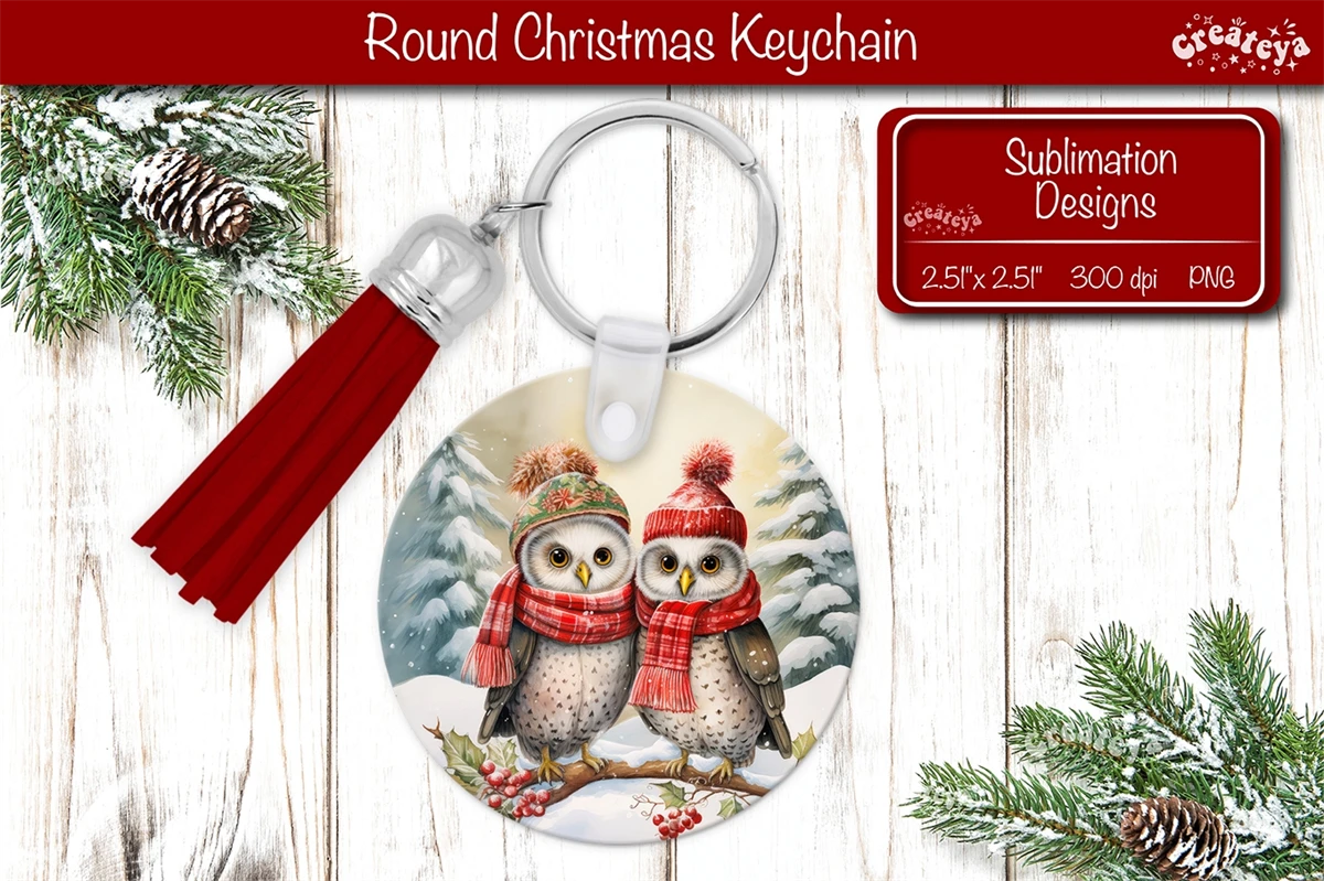 Round Christmas keychain sublimation with a cute Christmas Owl Keychain PNG. Christmas Sublimation Round keychain Perfect as a delightful gift.