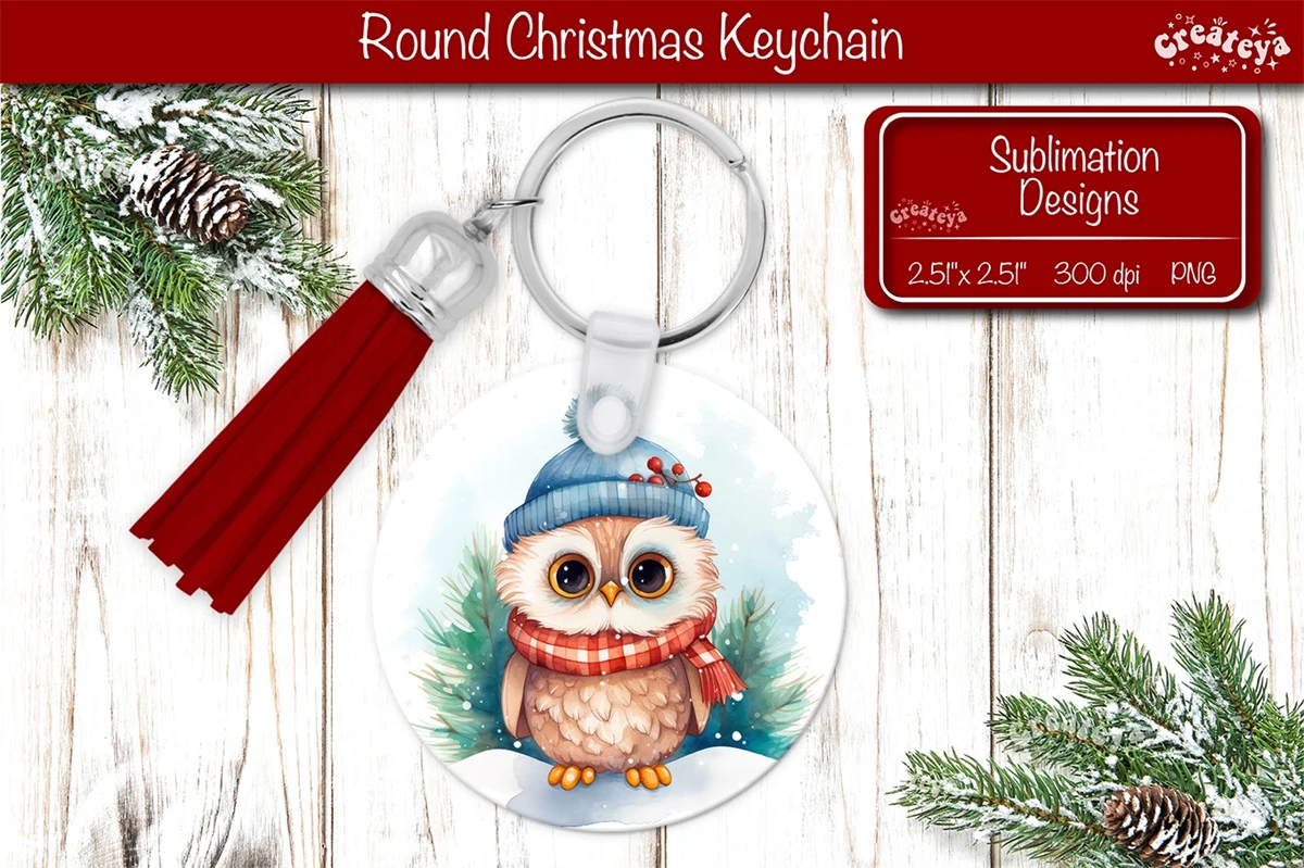 Round Christmas keychain sublimation with a cute Christmas Owl Keychain PNG. Christmas Sublimation Round keychain Perfect as a delightful gift.