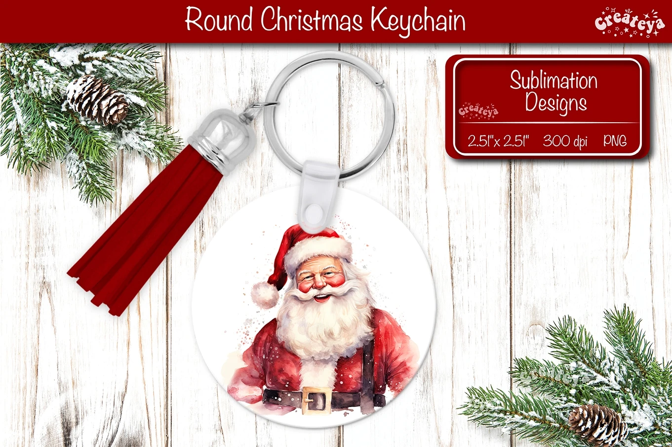 Round Christmas keychain sublimation with a Christmas Santa Keychain PNG. Christmas Sublimation Round keychain Perfect as a delightful gift.