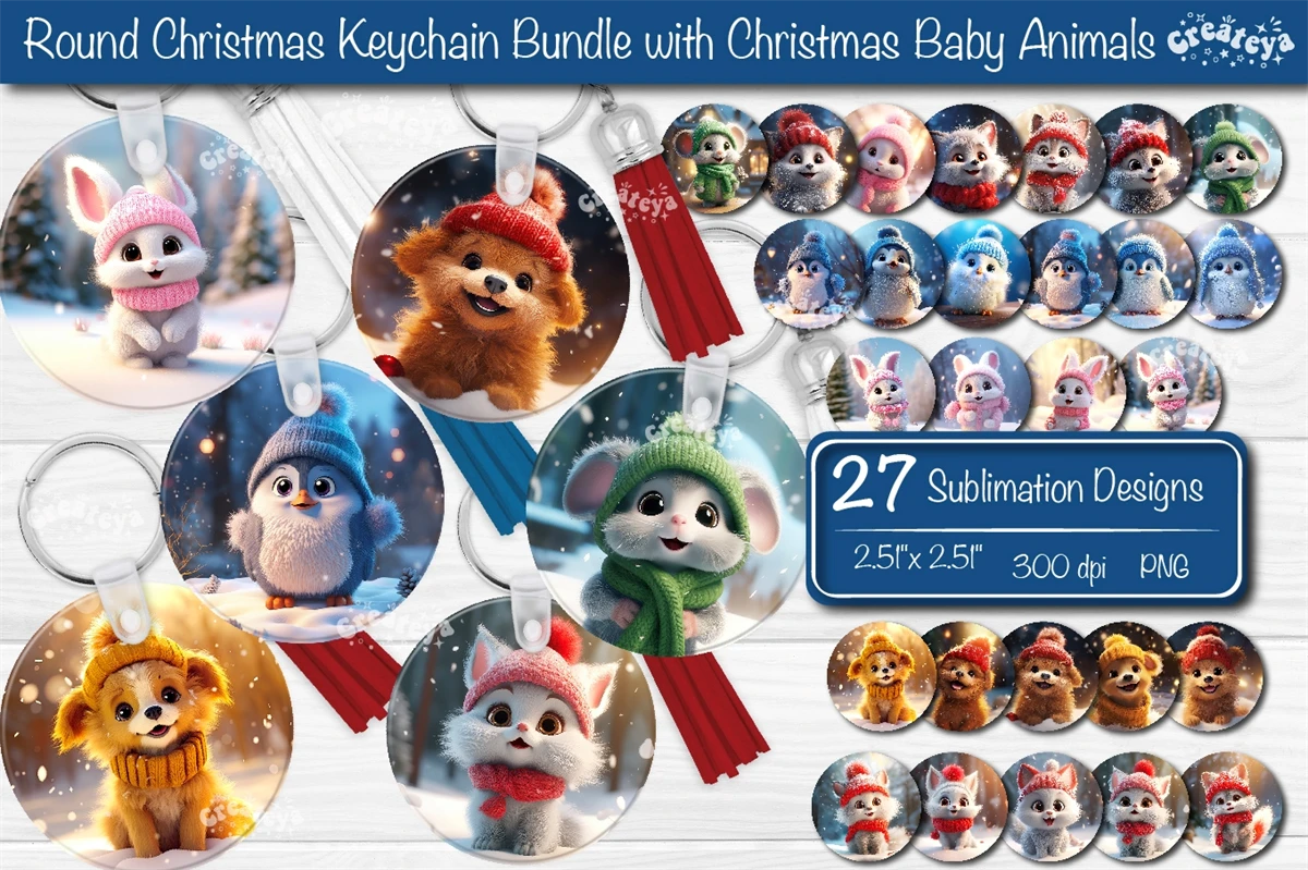 Christmas keychain sublimation Bundle contains 27 designs with cute Christmas Baby Animals prints Round Keychain PNG. Christmas Sublimation Round Keychain Perfect as a delightful gift.