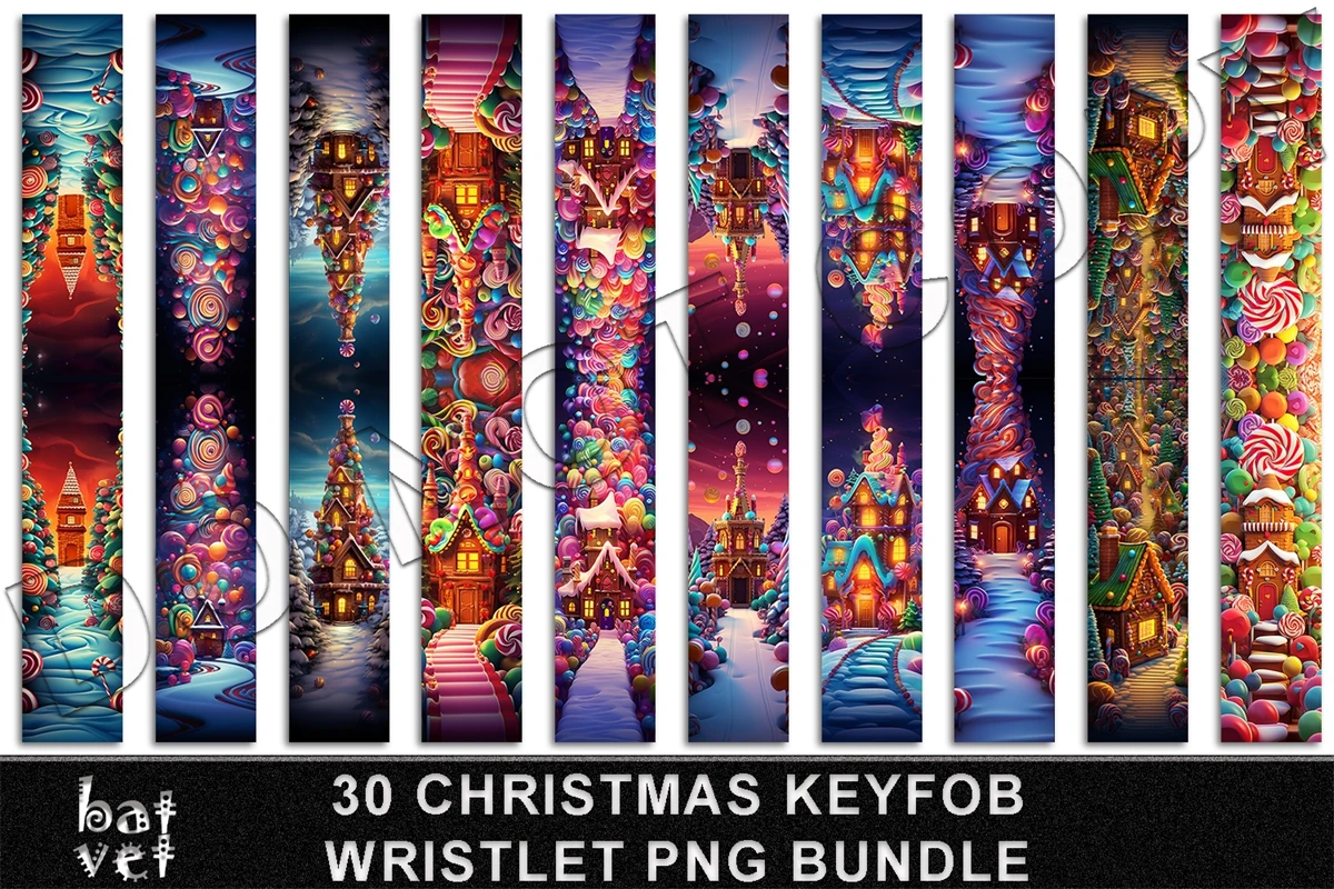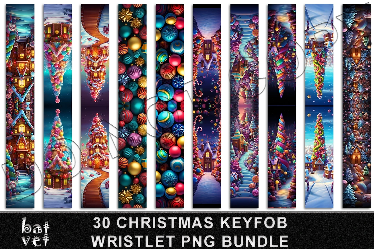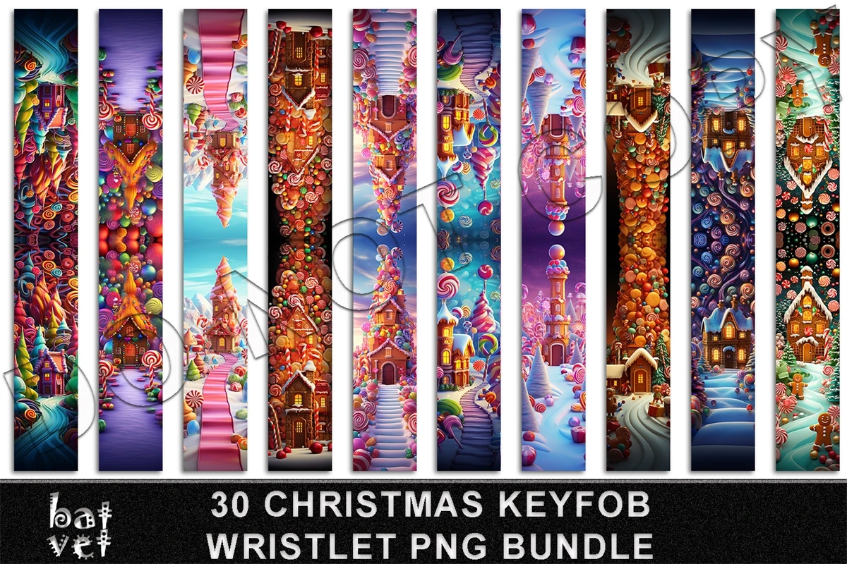 Christmas Wristlet Sublimation, Christmas Tree, Gingerbread House, Candy Cane, Christmas Ornaments, Colorful Designs.
