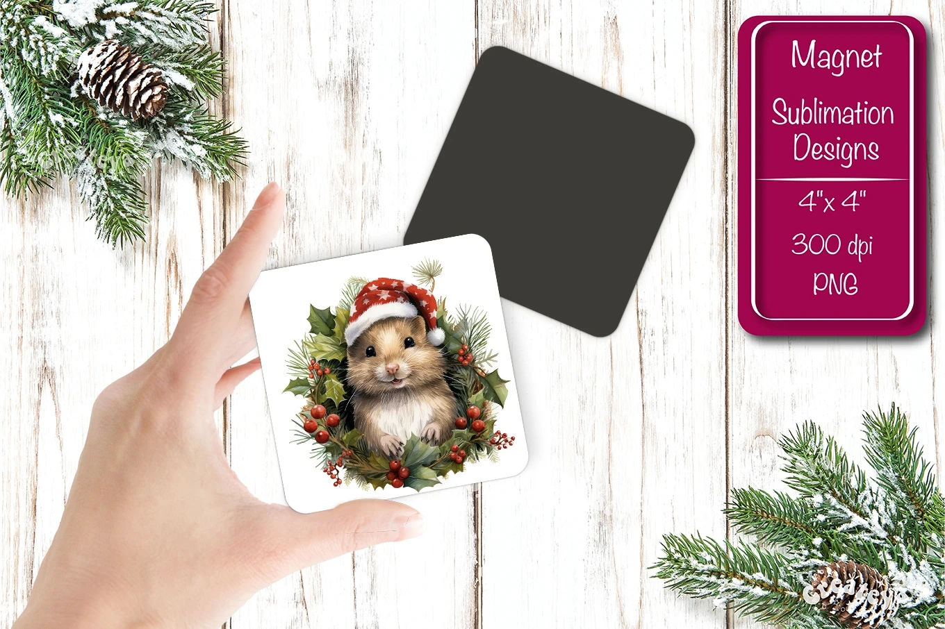 Square Christmas Magnet PNG design with a cute Watercolor Baby Animals PNG. These standard square magnets 4'' x 4'' charming magnets make for fantastic holiday gifts. Share the joy of the season with friends and family by sending them a piece of winter enchantment. Your fridge will thank you, and so will your heart!