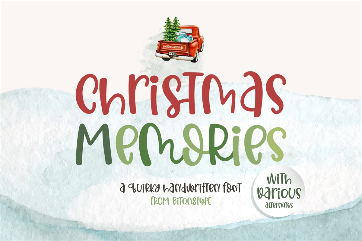 Christmas Memories is a quirky and laid-back handwritten font. Whatever the topic, this font will be a wonderful asset to your font library, as it has the potential to enhance any creation. Christmas Memories is PUA encoded which means you can access all of the amazing glyphs and ligatures with ease!