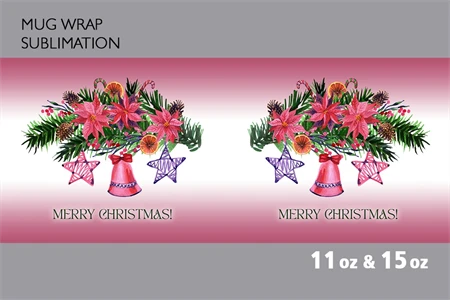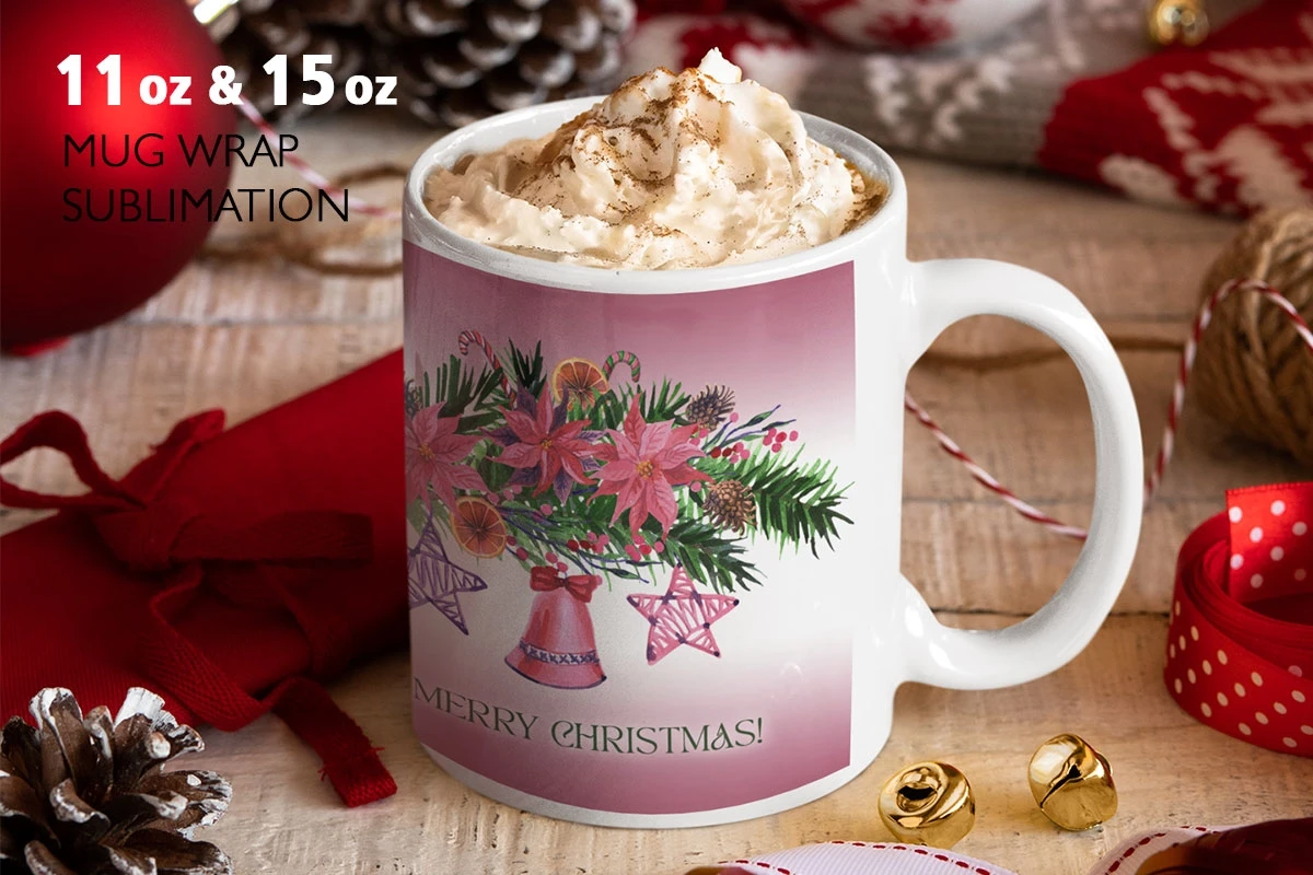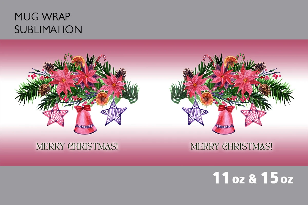 Watercolor hand painted Christmas poinsettias, mug wrap sublimation design for 11 oz and 15 oz.