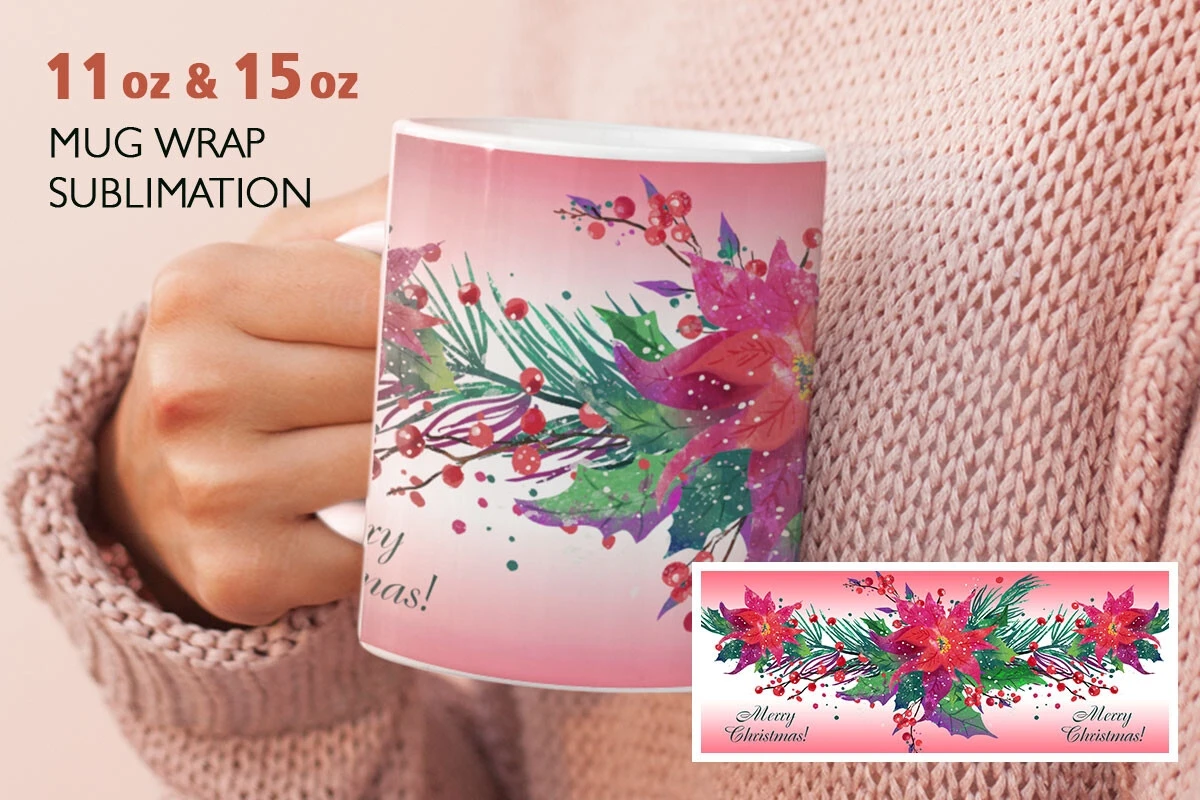 Watercolor digitally hand painted Christmas sublimation design for 11 oz and 15 oz.
