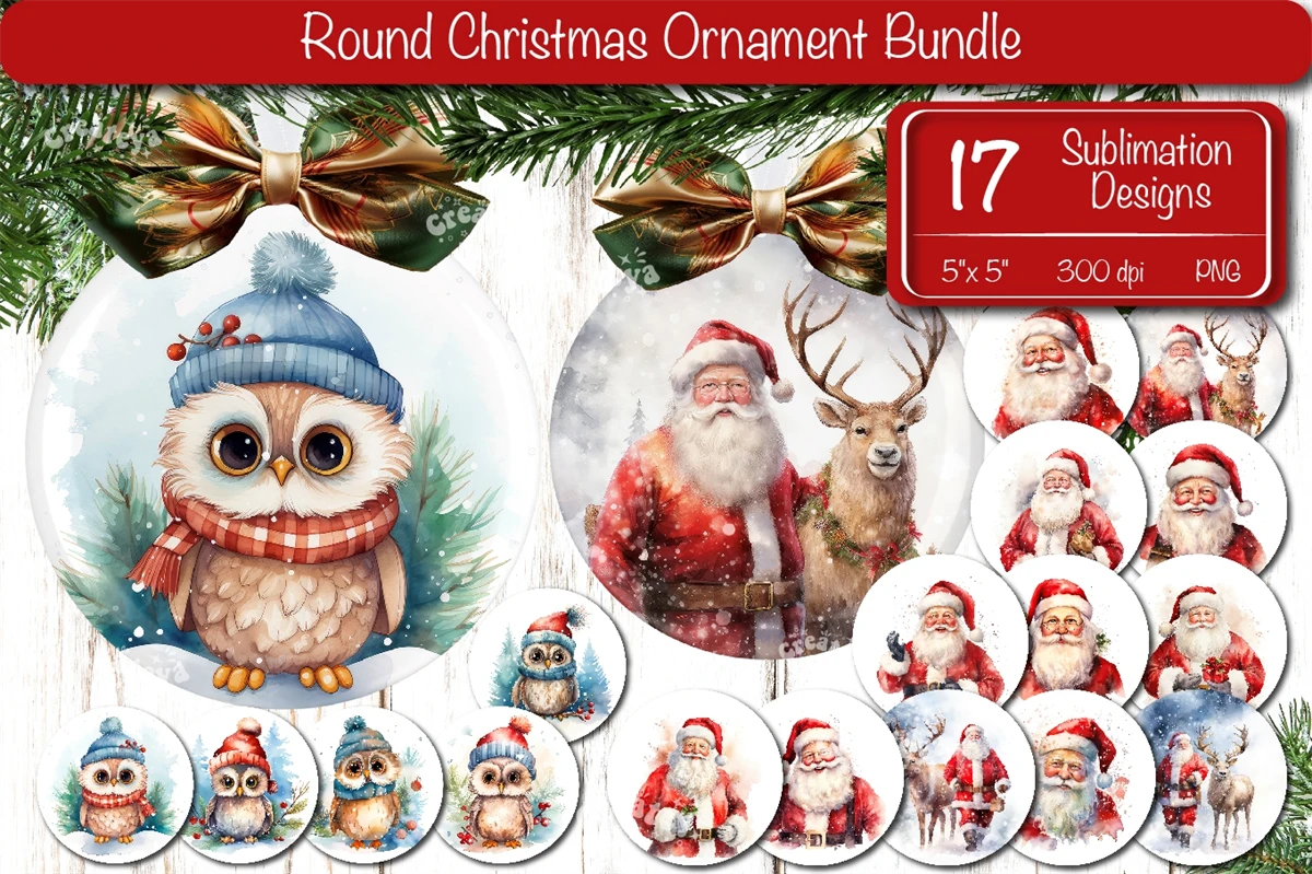 The Round Christmas ornament sublimation Bundle contains 17 designs with cute Watercolor Christmas Owls and Santa PNG. cute Christmas Sublimation Round Ornament! Adorable Animals, vibrant colors, and lasting memories.