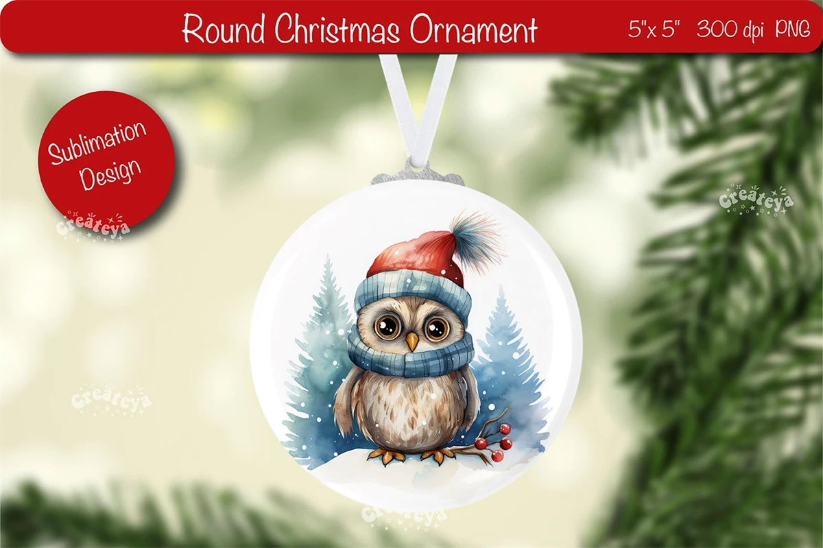 Round Christmas ornament sublimation with cute Watercolor Christmas Owl PNG. Cute Christmas Sublimation Round Ornament! Adorable animal, vibrant colors, and lasting memories. Perfect for your tree or as a delightful gift. Happy holidays!