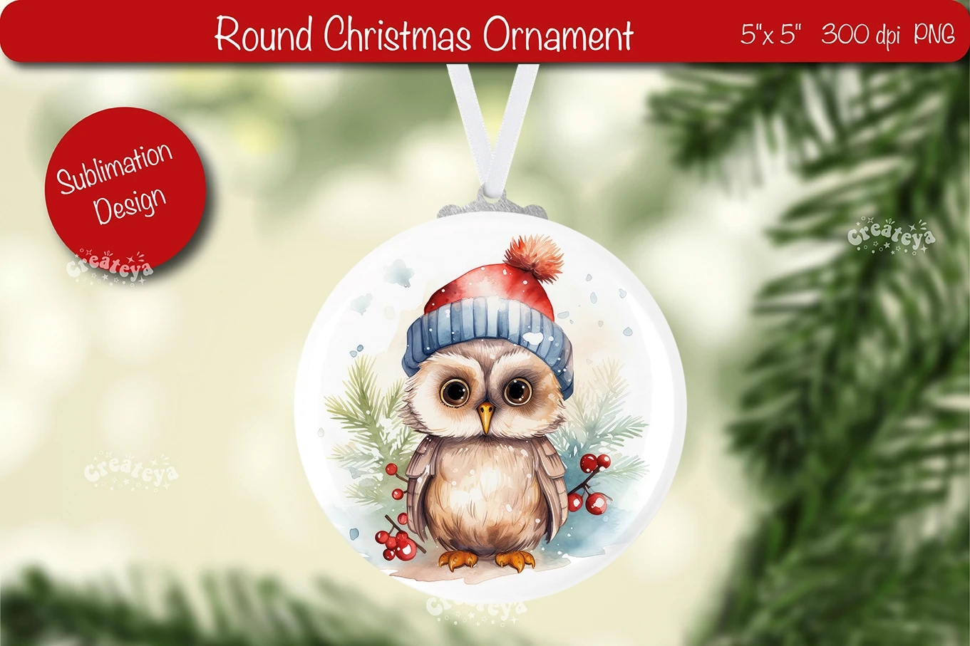 Round Christmas ornament sublimation with cute Watercolor Christmas Owl PNG. Cute Christmas Sublimation Round Ornament! Adorable animal, vibrant colors, and lasting memories. Perfect for your tree or as a delightful gift. Happy holidays!