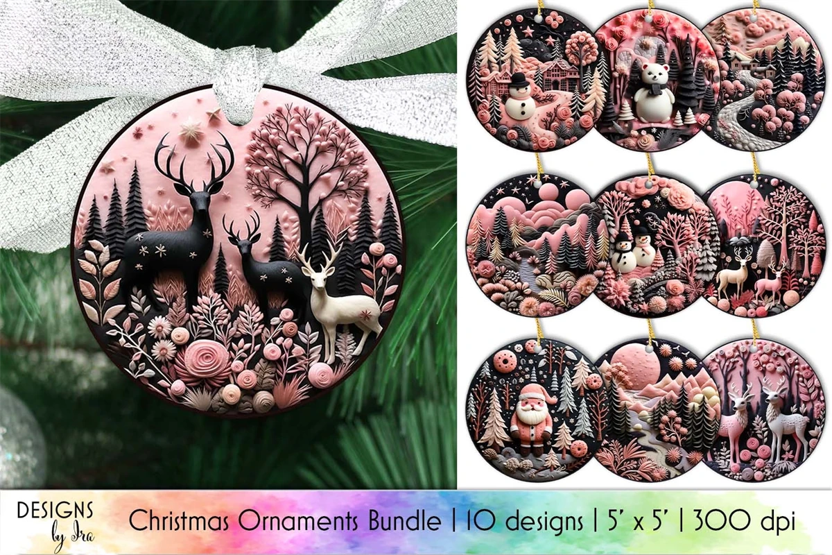 Christmas Ornaments with Felted Fabric & Embroidery 3D Effect, printable designs, bundle of 10 round ornaments designs.