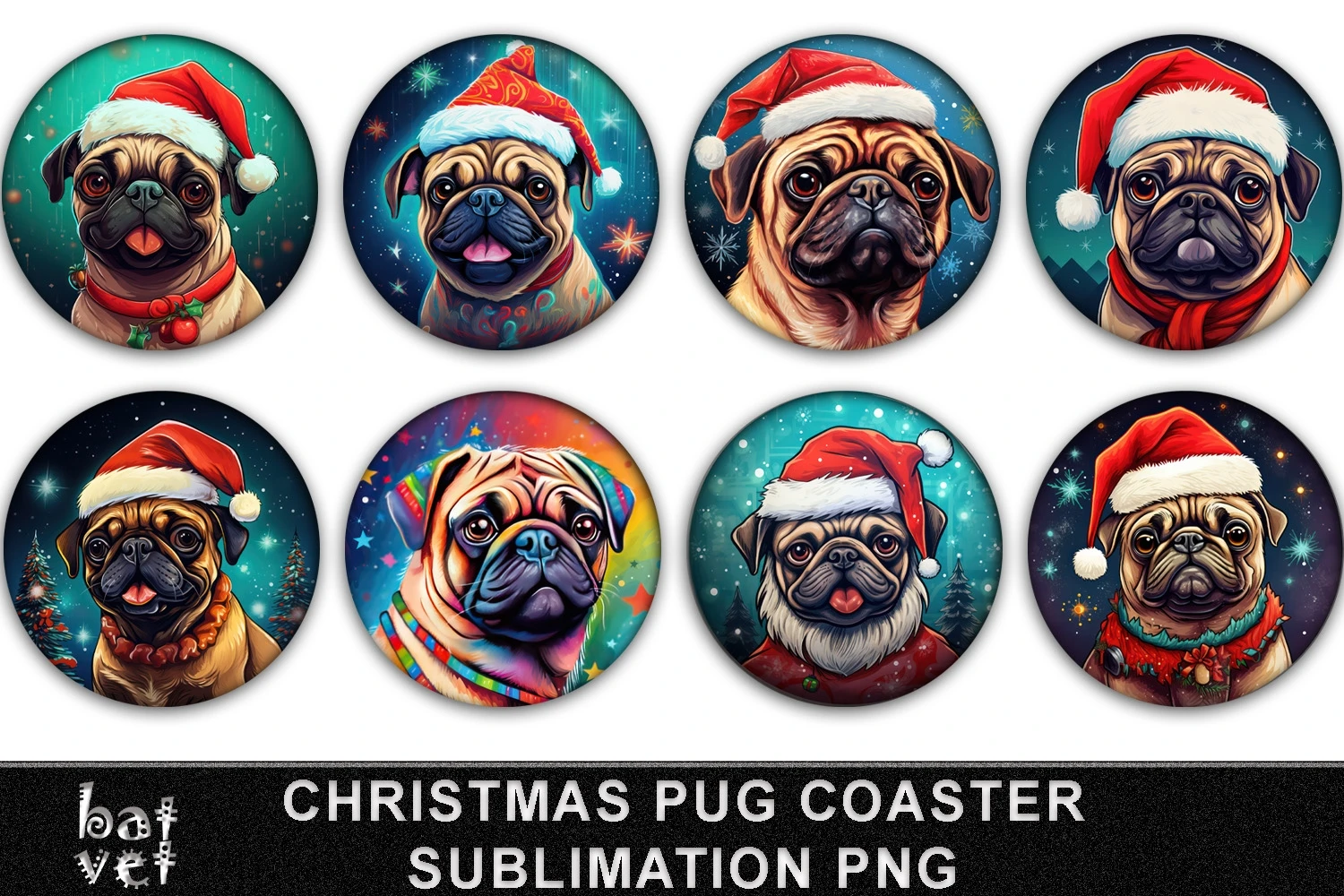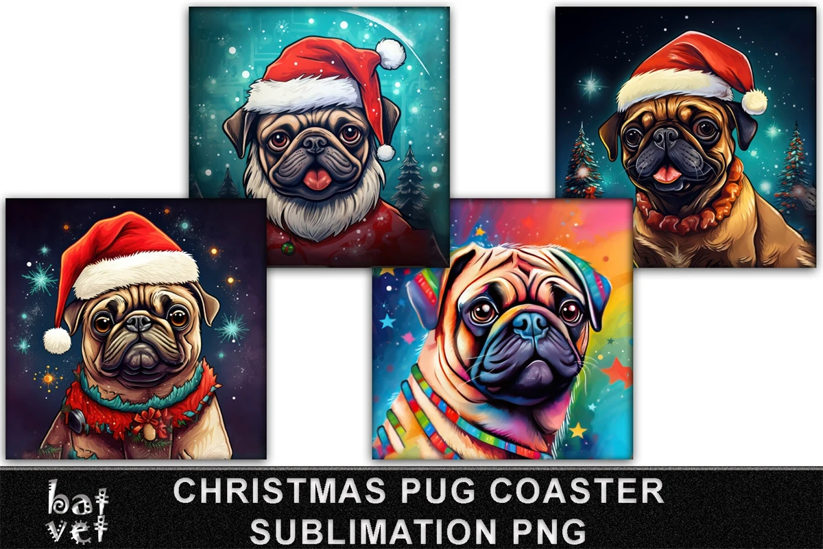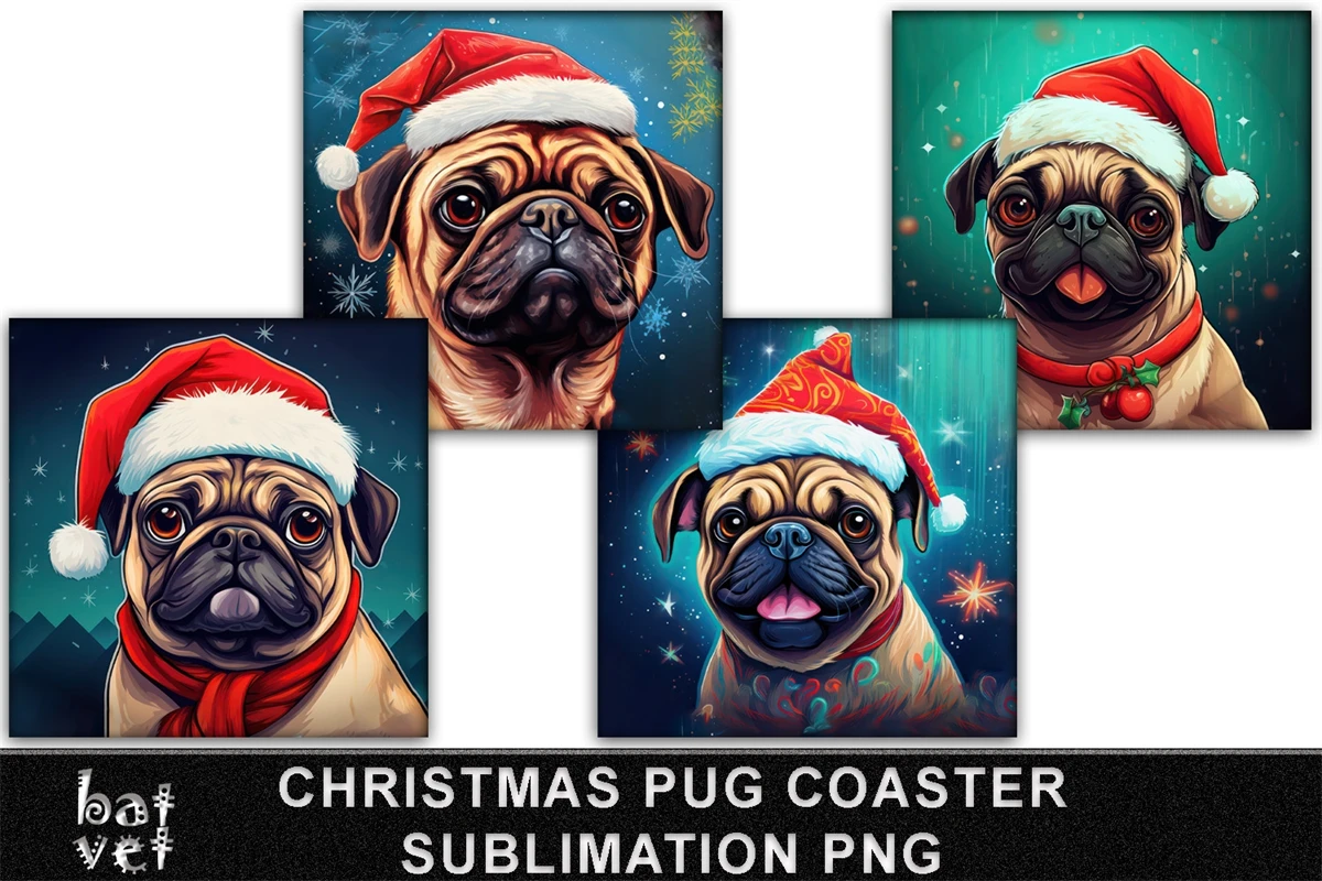 Christmas Pug Coaster Sublimation / Christmas Dog Coaster PNG / 8 Xmas Coaster Designs