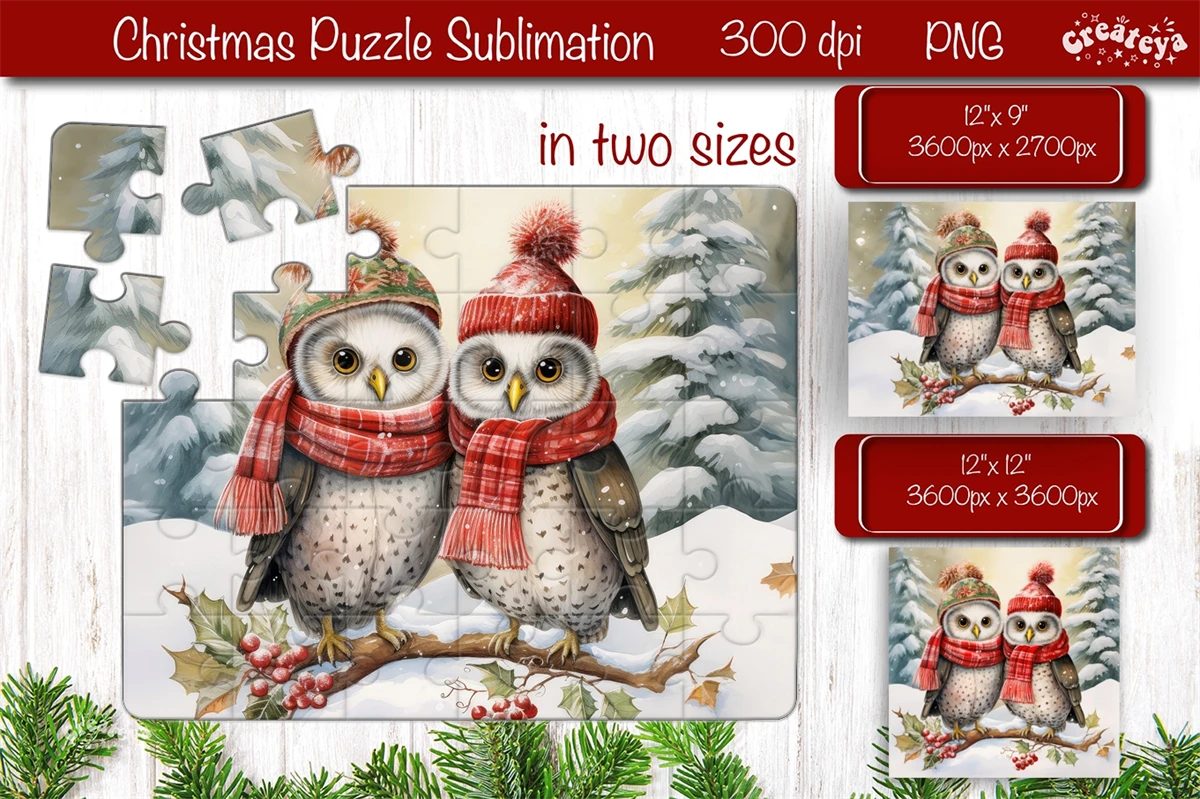Christmas Puzzle PNG sublimation with cute Watercolor Christmas Owl PNG.
