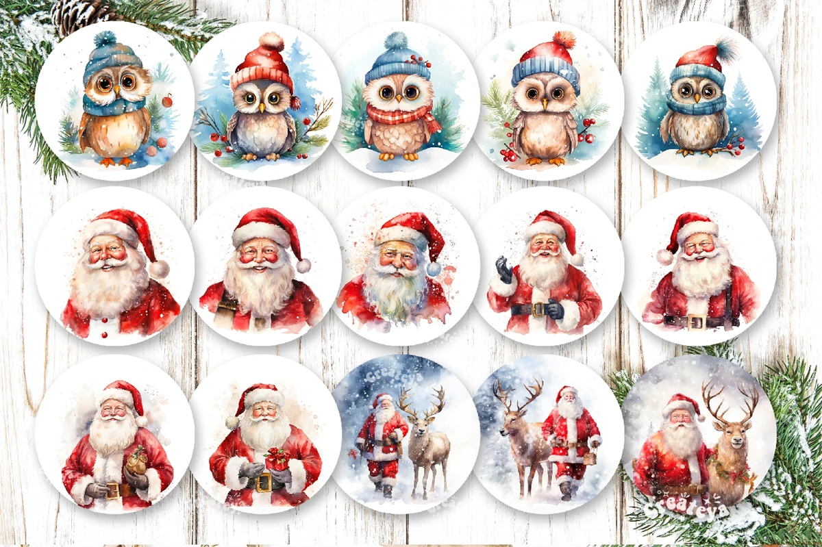 Christmas Round Earring Bundle Sublimation Design with watercolor Owl and Santa. The Bundle contains 15 designs with cute Owl and Santa. Express your individuality, elevate your mood, and spread joy with these earrings. They also make a perfect gift for any occasion. Embrace your unique style and let the Christmas Earrings be your artistic expression!