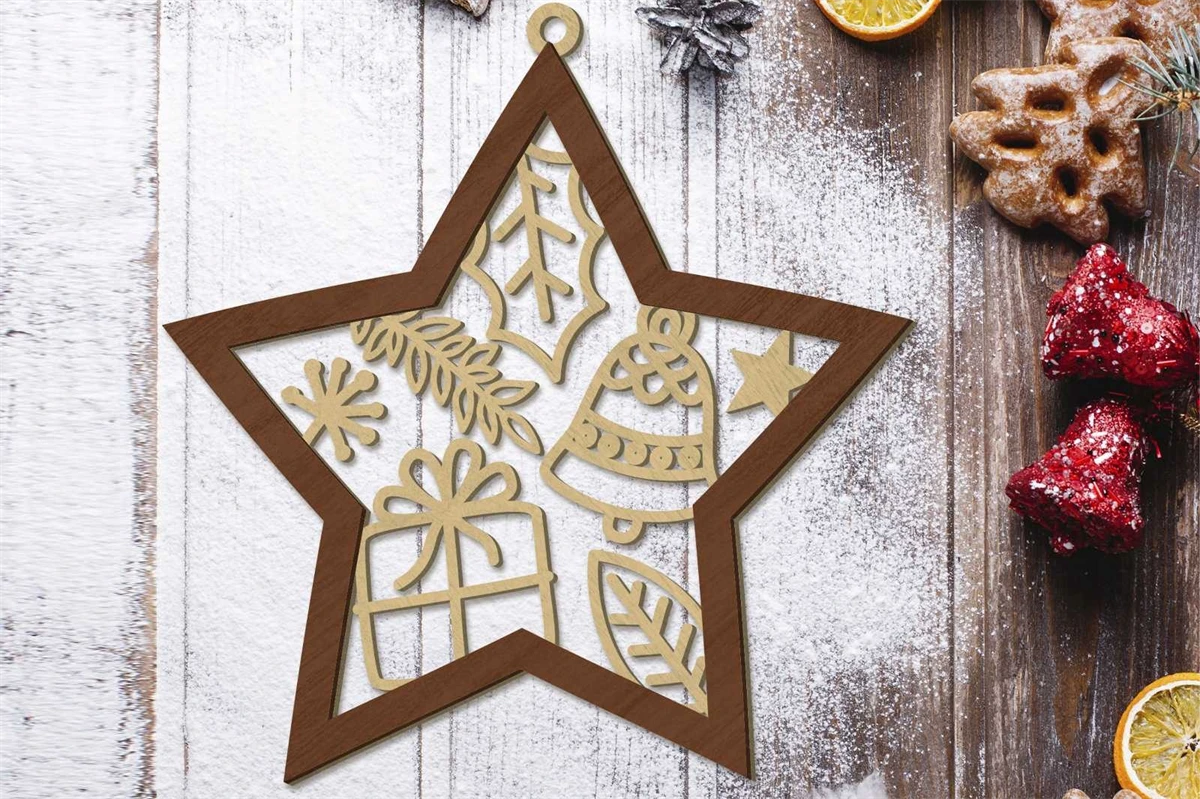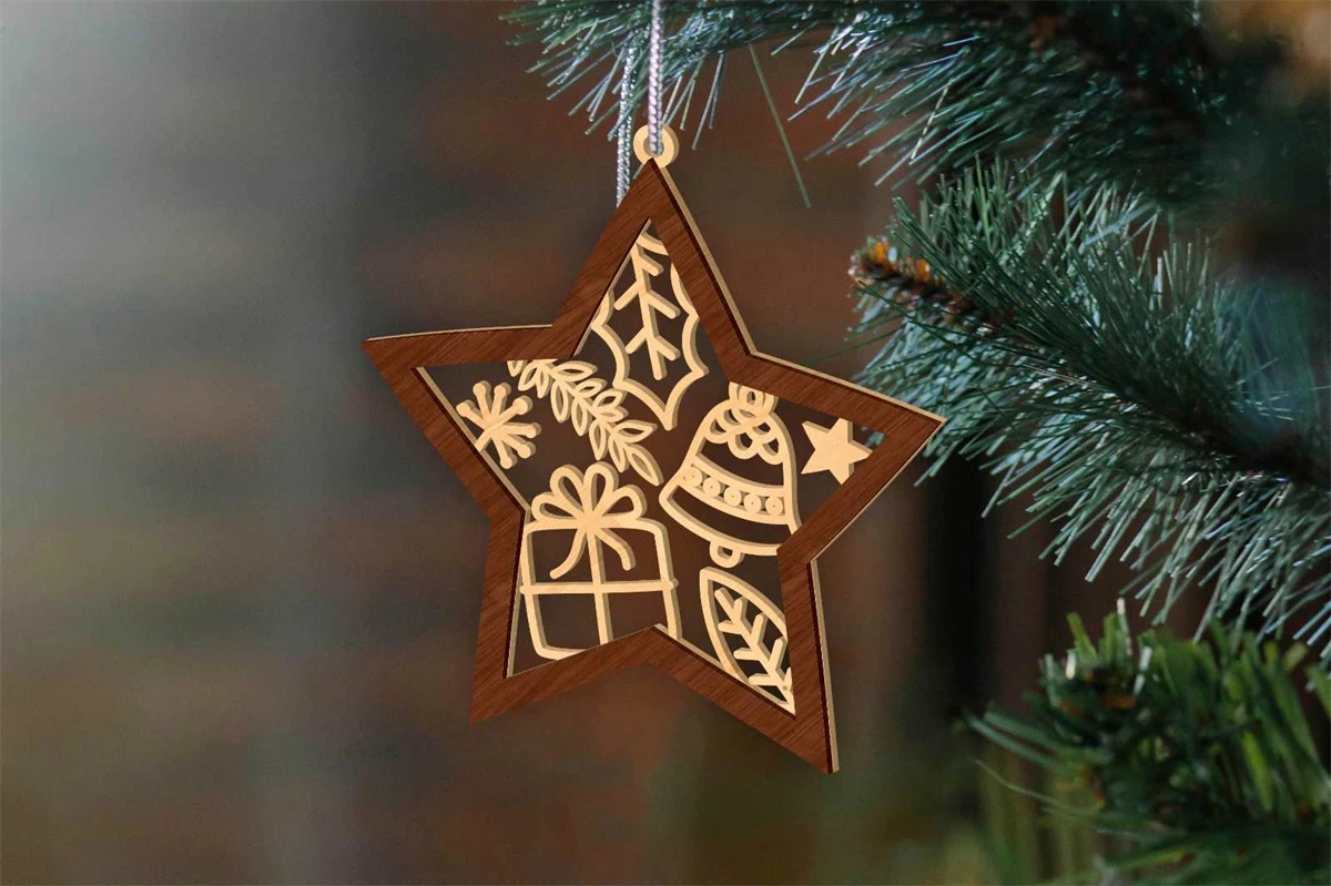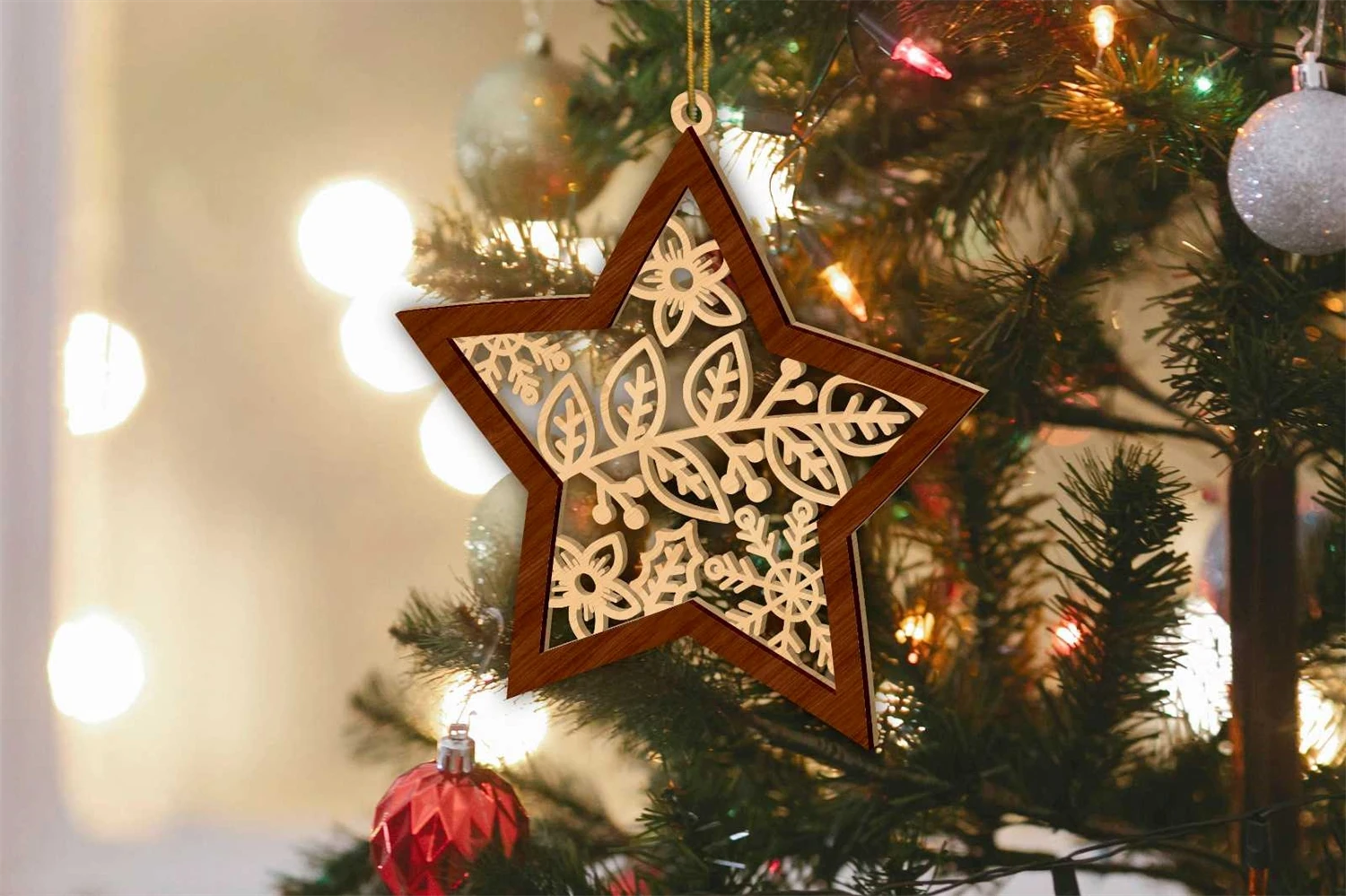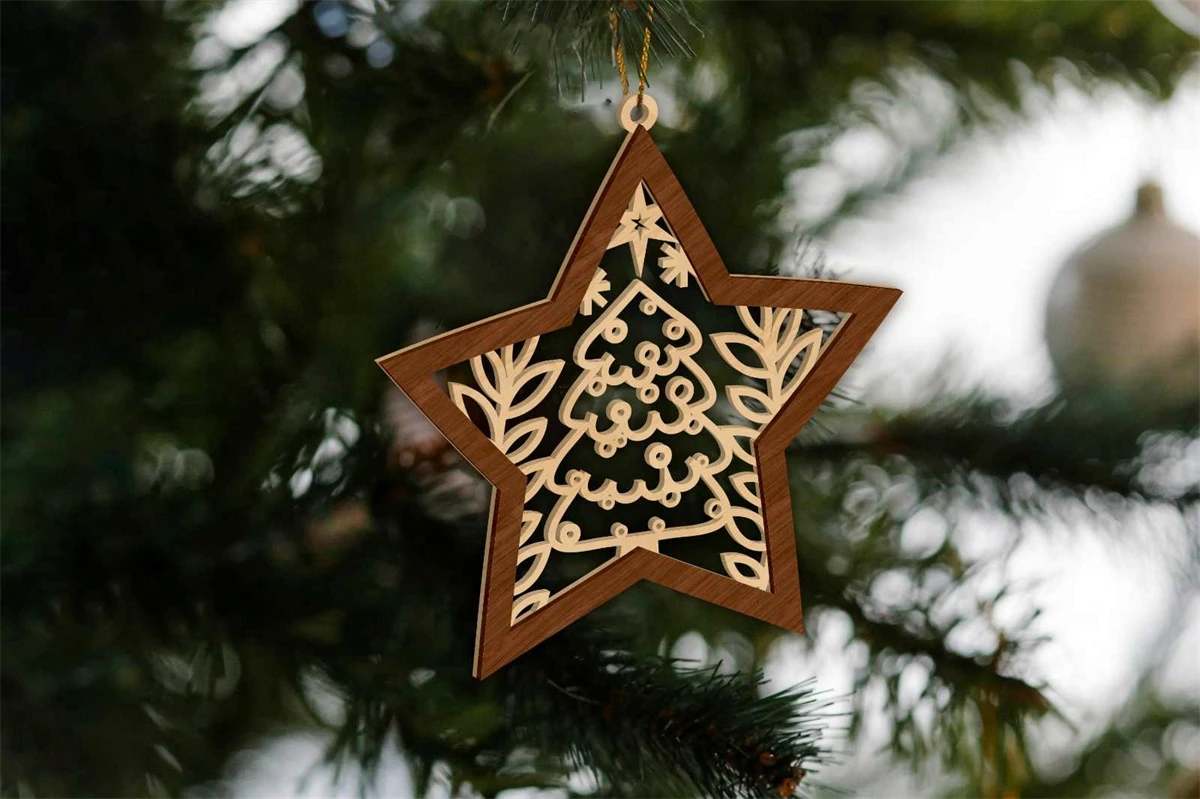 CHRISTMAS STARS ORNAMENTS Digital multilayer layout files are specially prepared for the laser cut, CNC router machine and other cutting machines. Layered Christmas Ornament is festive and eye-catching decorations that add a touch of elegance and charm to your holiday tree or home decor. This ornament is carefully crafted with multiple layers of materials, each contributing to the overall design and visual appeal.