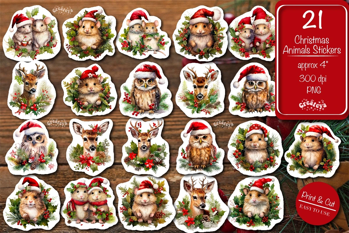 The Christmas stickers Bundle contains 21 designs with a Cute watercolor Christmas animal design. Cute stickers Design.