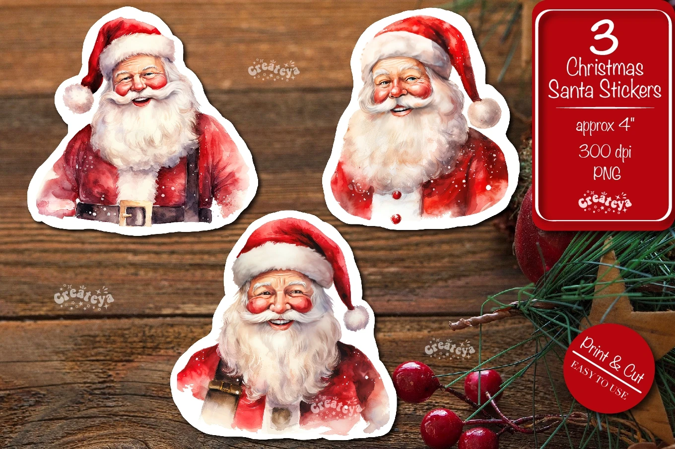 The Christmas stickers Bundle contains 3 designs with a watercolor Santa design. Cute stickers Design.