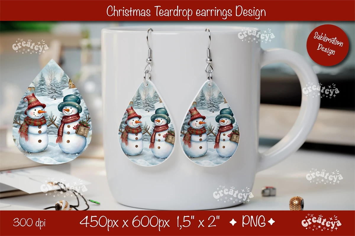 Christmas teardrop earrings sublimation design with watercolor Snowman. Express your individuality, elevate your mood, and spread joy with these earrings. They also make a perfect gift for any occasion. Embrace your unique style and let the Christmas Earrings be your artistic expression!