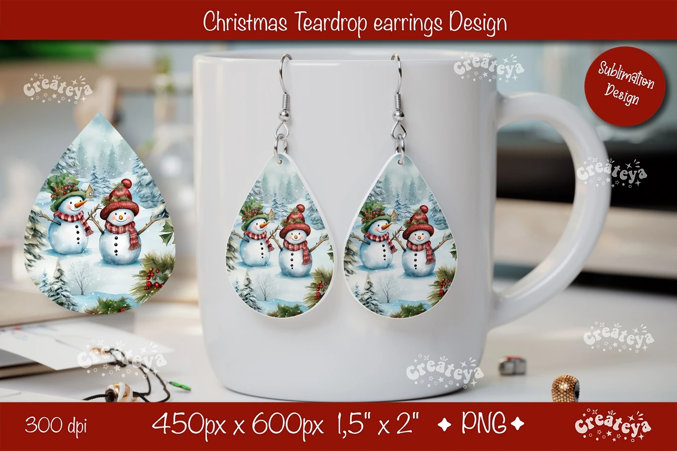 Christmas teardrop earrings sublimation design with watercolor Snowman. Express your individuality, elevate your mood, and spread joy with these earrings. They also make a perfect gift for any occasion. Embrace your unique style and let the Christmas Earrings be your artistic expression!