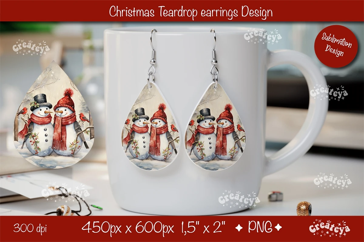 Christmas teardrop earrings sublimation design with watercolor Snowman. Express your individuality, elevate your mood, and spread joy with these earrings. They also make a perfect gift for any occasion. Embrace your unique style and let the Christmas Earrings be your artistic expression!