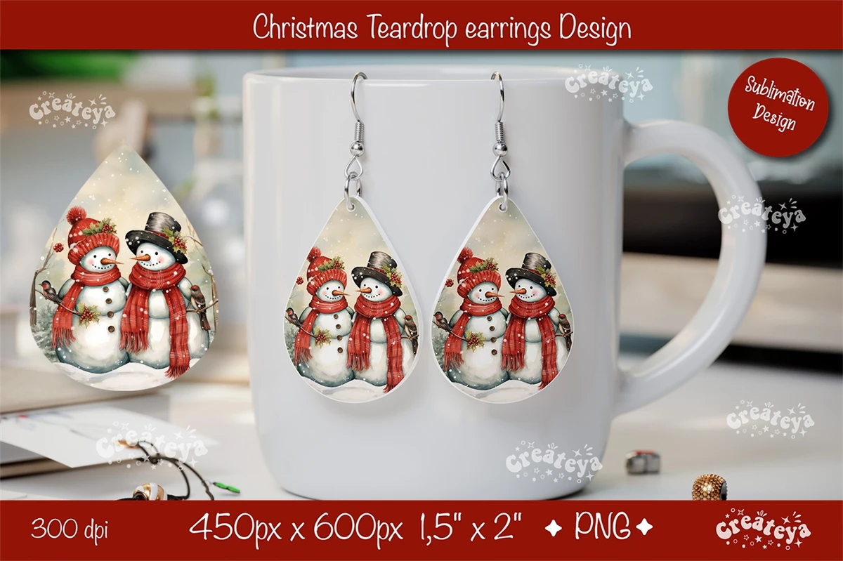 Christmas teardrop earrings sublimation design with watercolor Snowman. Express your individuality, elevate your mood, and spread joy with these earrings. They also make a perfect gift for any occasion. Embrace your unique style and let the Christmas Earrings be your artistic expression!