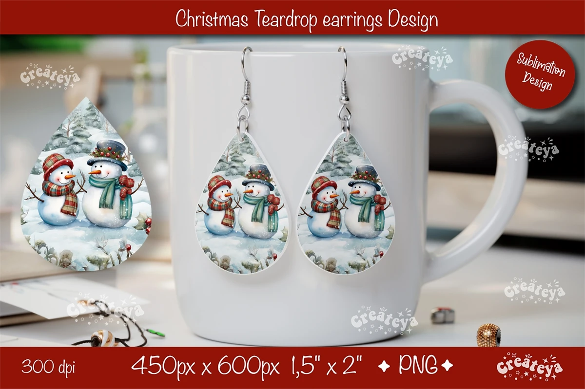 Christmas teardrop earrings sublimation design with watercolor Snowman. Express your individuality, elevate your mood, and spread joy with these earrings. They also make a perfect gift for any occasion. Embrace your unique style and let the Christmas Earrings be your artistic expression!
