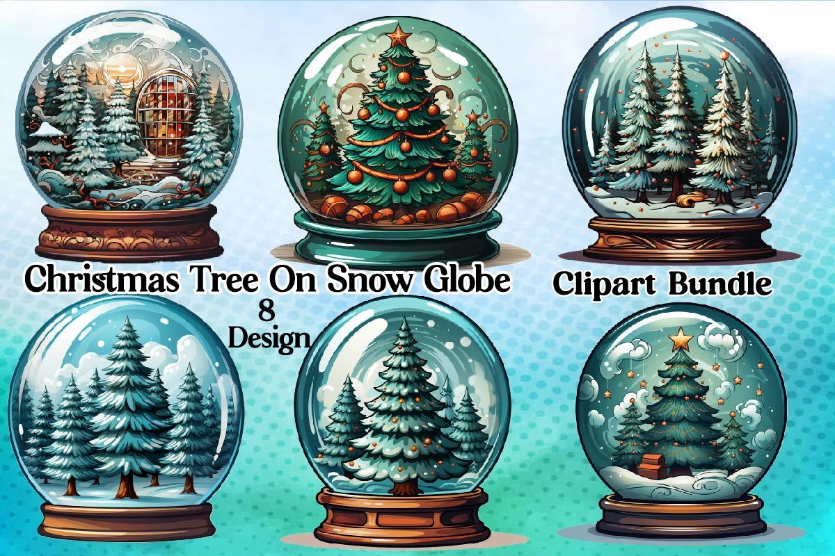Watercolor Christmas Tree On Snow Globe Clipart PNG Bundle