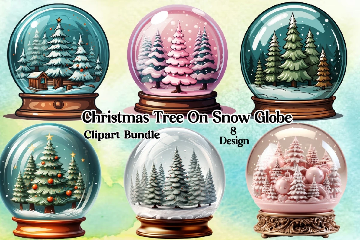 Watercolor Christmas Tree On Snow Globe Clipart PNG Bundle
