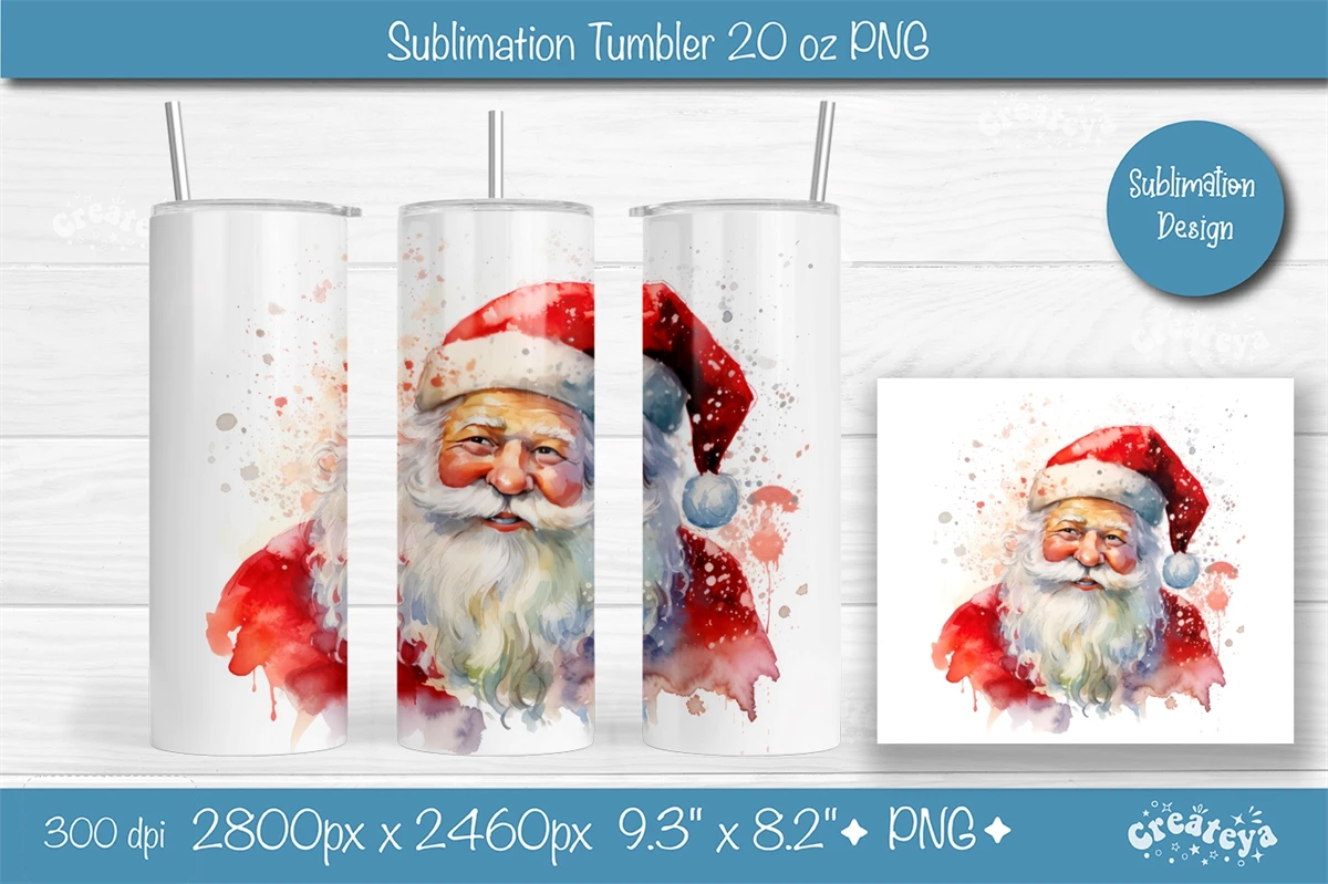 Xmas Tumbler, Christmas Tumbler wrap 20 Oz sublimation design PNG. This 20 oz skinny Christmas tumbler sublimation design with an eye-catching watercolor Santa.
