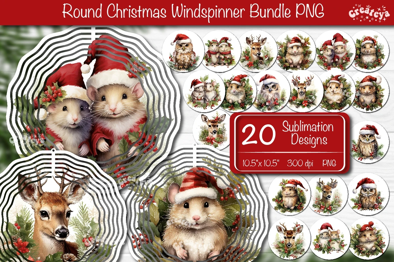 Round Christmas Wind Spinner Bundle contains 20 designs with a cute Christmas animals PNG. These Christmas bundle of wind spinners bring a touch of snow-filled charm and a warm, fuzzy feeling to your home decor.