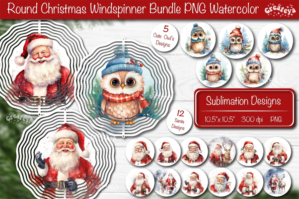 Round Christmas Wind Spinner Bundle with Vintage Santa and Owl PNG. Bundle contains 18 designs PNG These Christmas designs of wind spinner bring a touch of snow-filled charm and a warm, fuzzy feeling to your home decor.