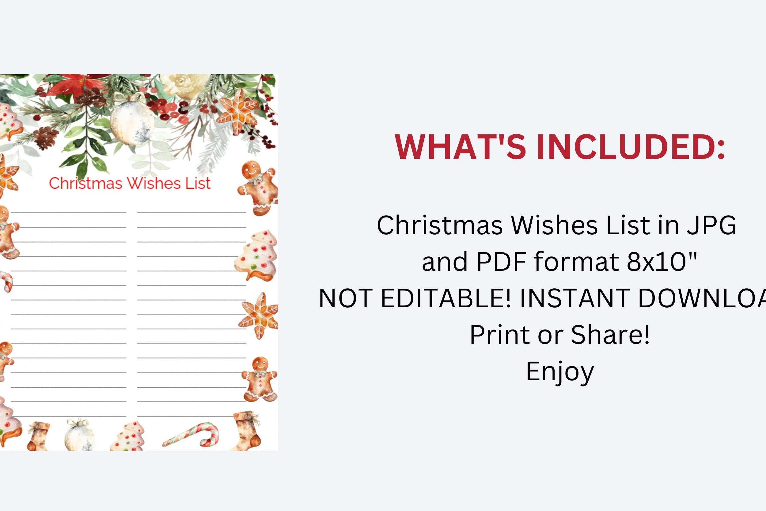Spread holiday cheer with our "Christmas Wishes List" printable Santa wish list! This delightful and festive template allows children (and adults!) to jot down their Christmas wishes in style. Featuring whimsical designs and classic holiday motifs, it's perfect for enhancing the magic of the season. Simply print, fill out, and share with Santa for a fun holiday tradition. Create cherished memories and keep the spirit of Christmas alive with this festive wish list!